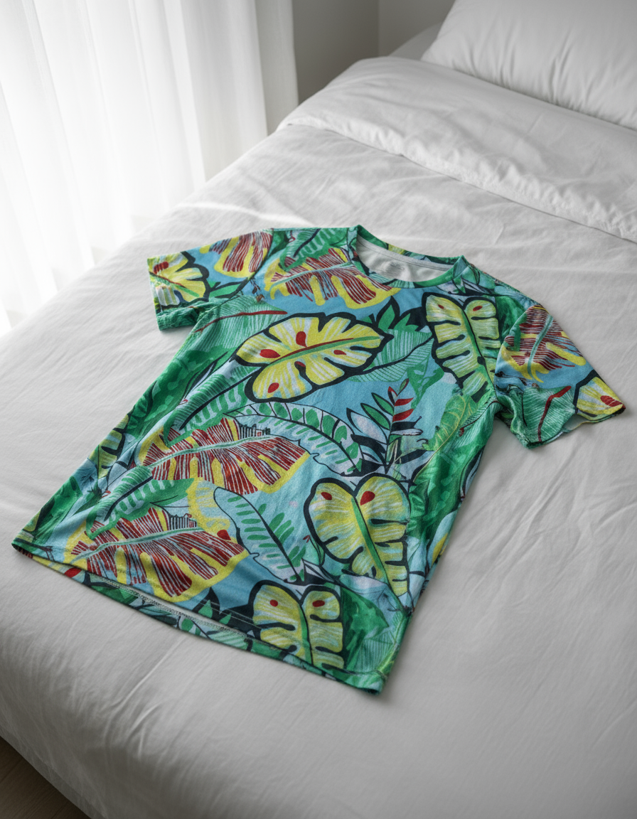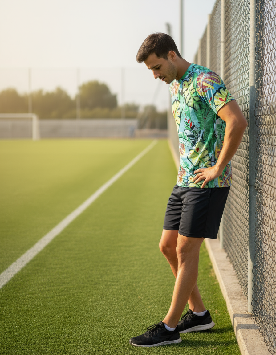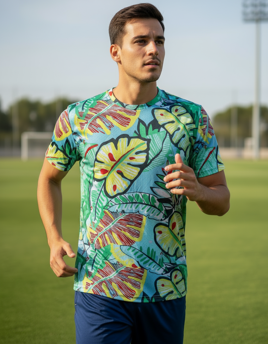 – **Diseño Único:** La camiseta presenta un estampado exuberante que combina tonos verdes, amarillos y anaranjados, evocando la esencia de un vibrante bioma tropical. Su diseño audaz te hará destacar mientras juegas.