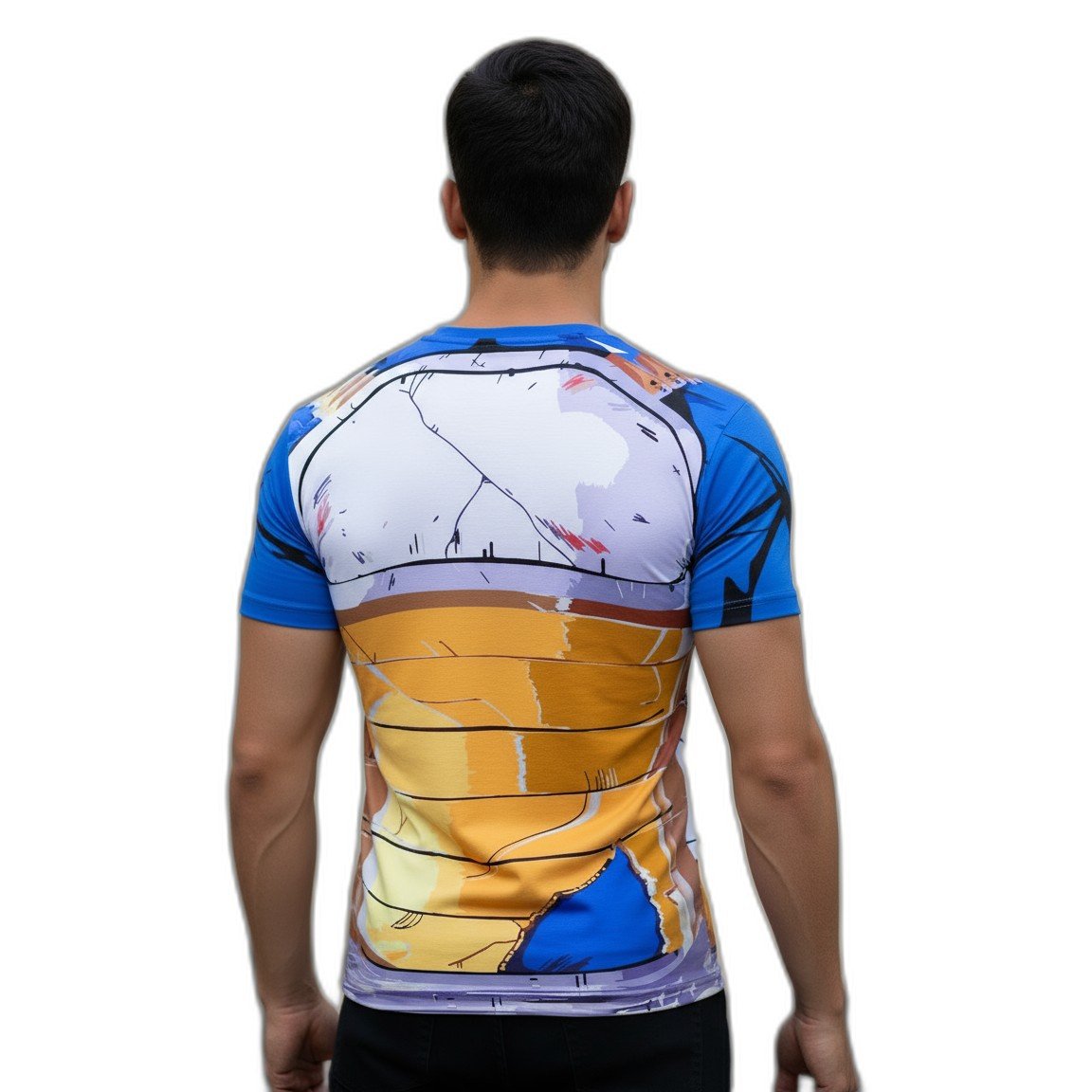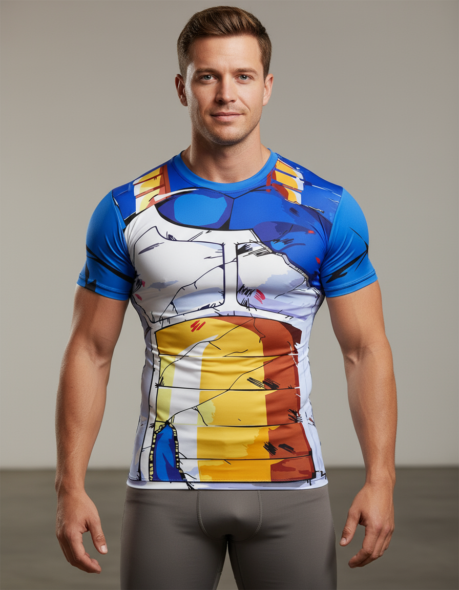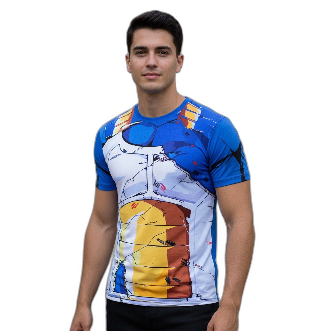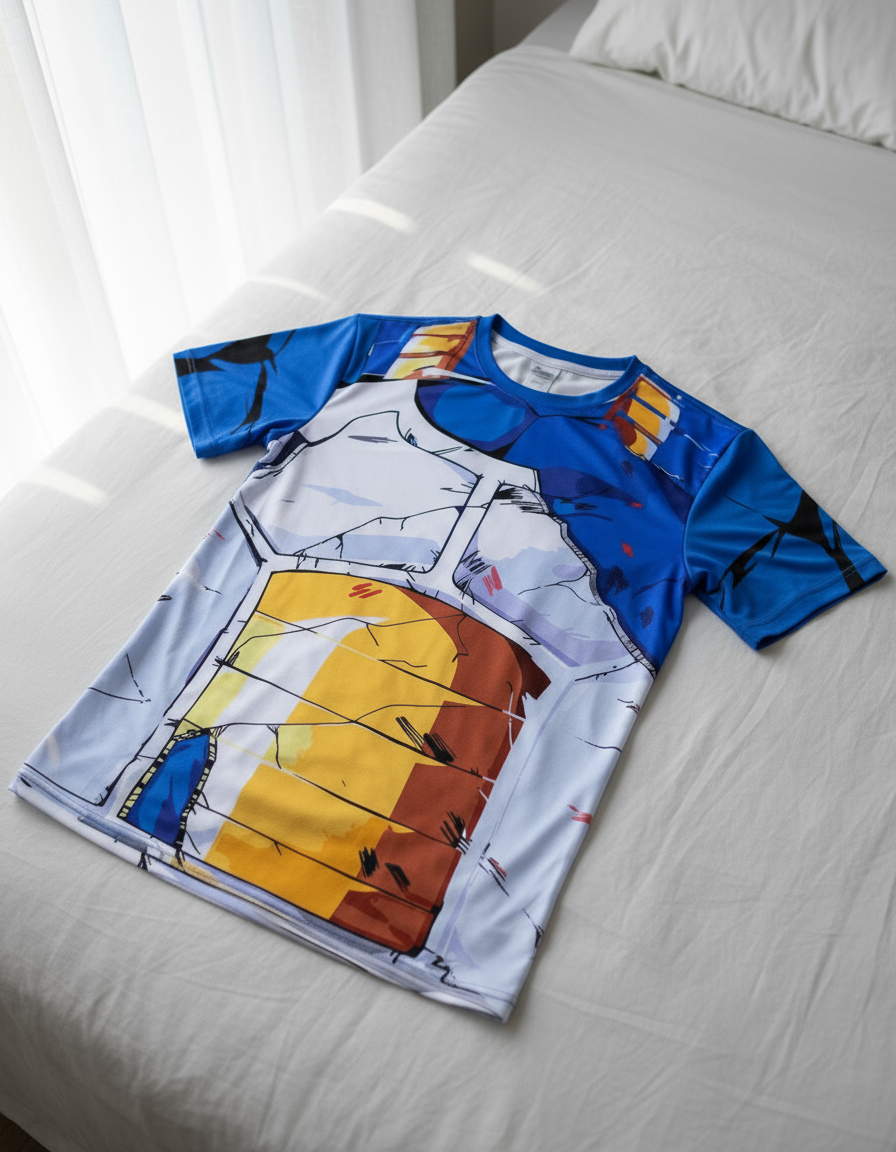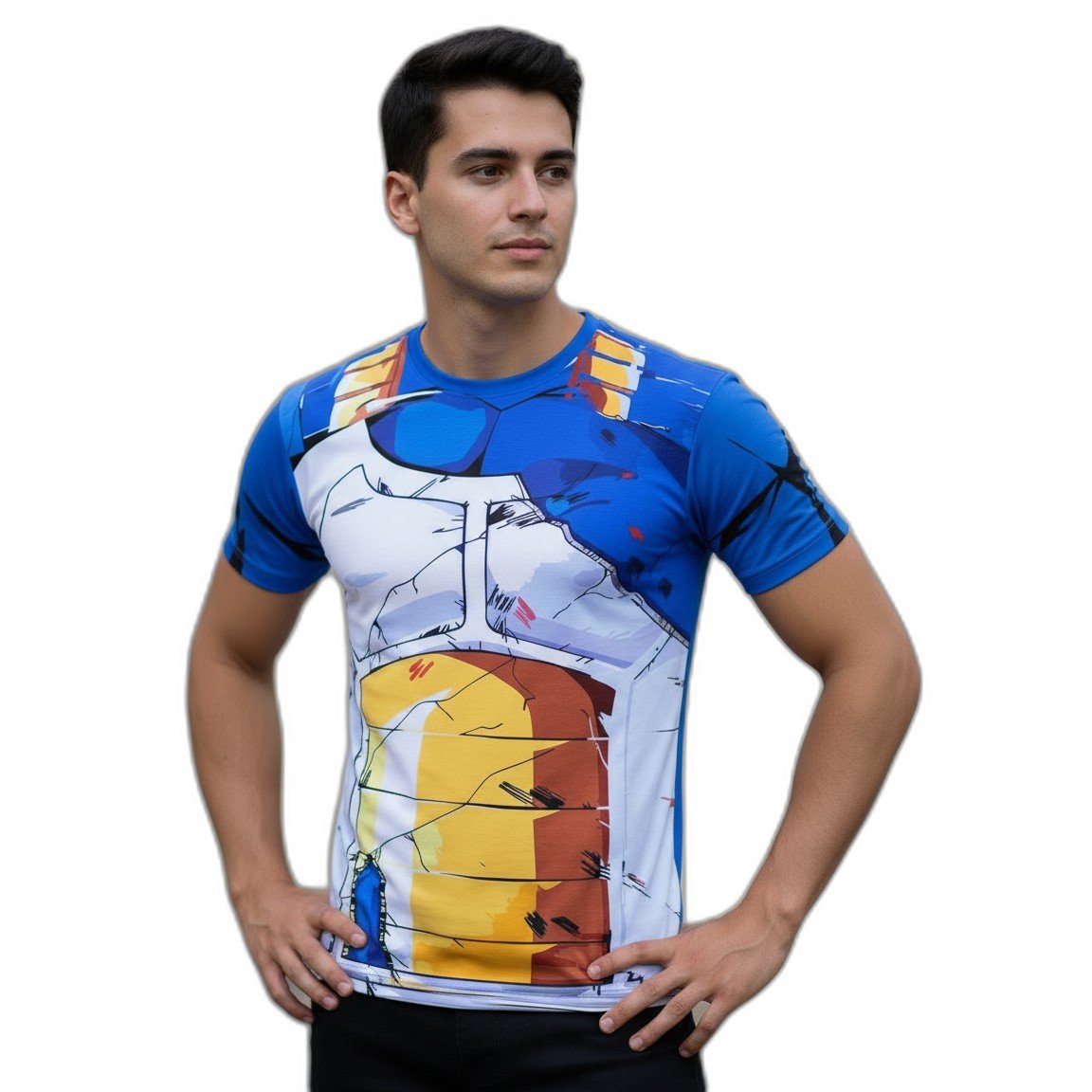 El diseño vibrante y detallado presenta la emblemática armadura de Vegeta, destacándose con colores intensos que no se desvanecen con el tiempo. Su corte moderno se adapta a cualquier figura, haciendo de esta prenda una pieza versátil que se puede llevar en cualquier ocasión, ya sea durante una maratón de tu serie favorita o en una salida informal con amigos.