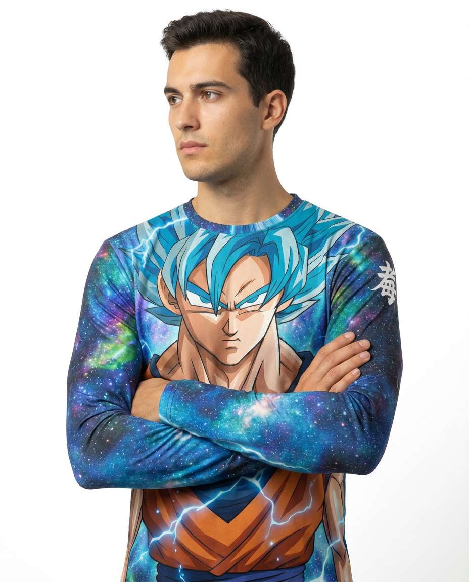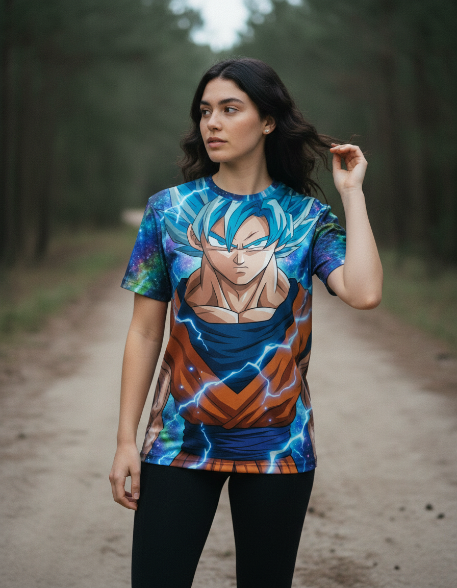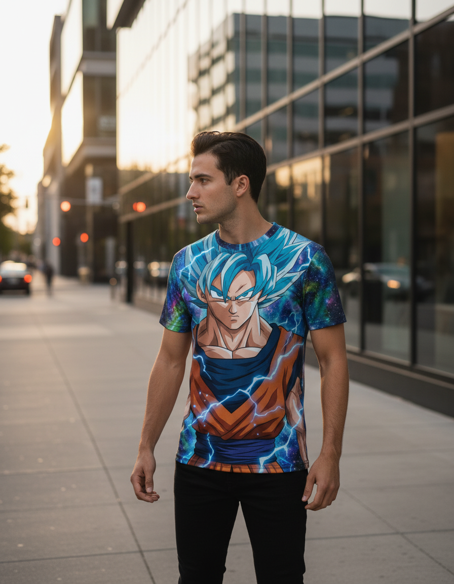 Fabricada con algodón de primera calidad, esta prenda no solo ofrece una suavidad excepcional, sino que también garantiza un ajuste perfecto que se adapta a tu cuerpo para brindarte comodidad durante todo el día, sin importar la ocasión. El vibrante diseño gráfico presenta a Goku en su impresionante Fase Dios, complementado por un acabado duradero que asegura que los colores brillen intensa y fielmente lavado tras lavado.