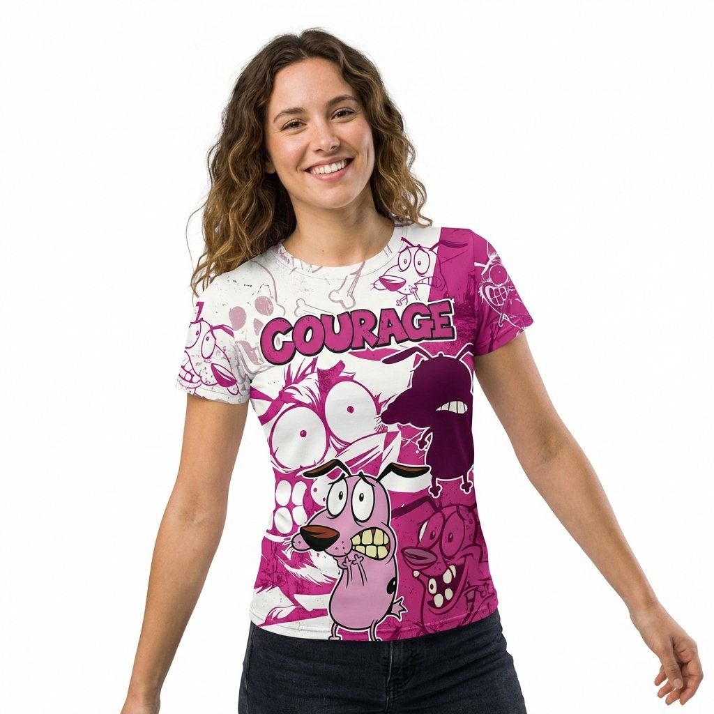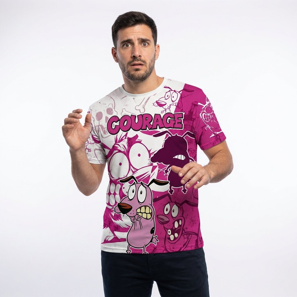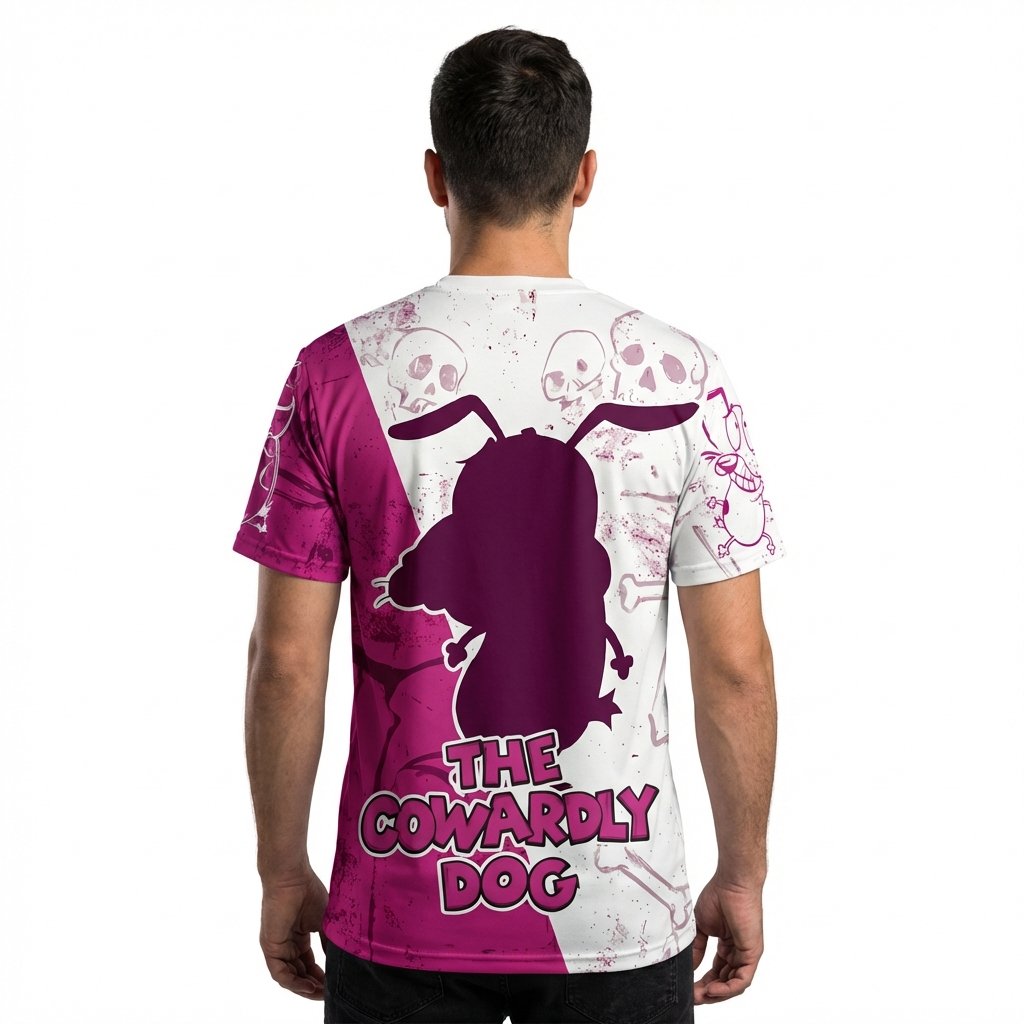 Remera premium de poliéster sublimada con diseño de Coraje el Perro Cobarde. Full Print con diseño split en fucsia y blanco, con ilustraciones icónicas de Coraje y calaveras. Incluye dorso con silueta de Coraje y el texto ‘THE COWARDLY DOG’.