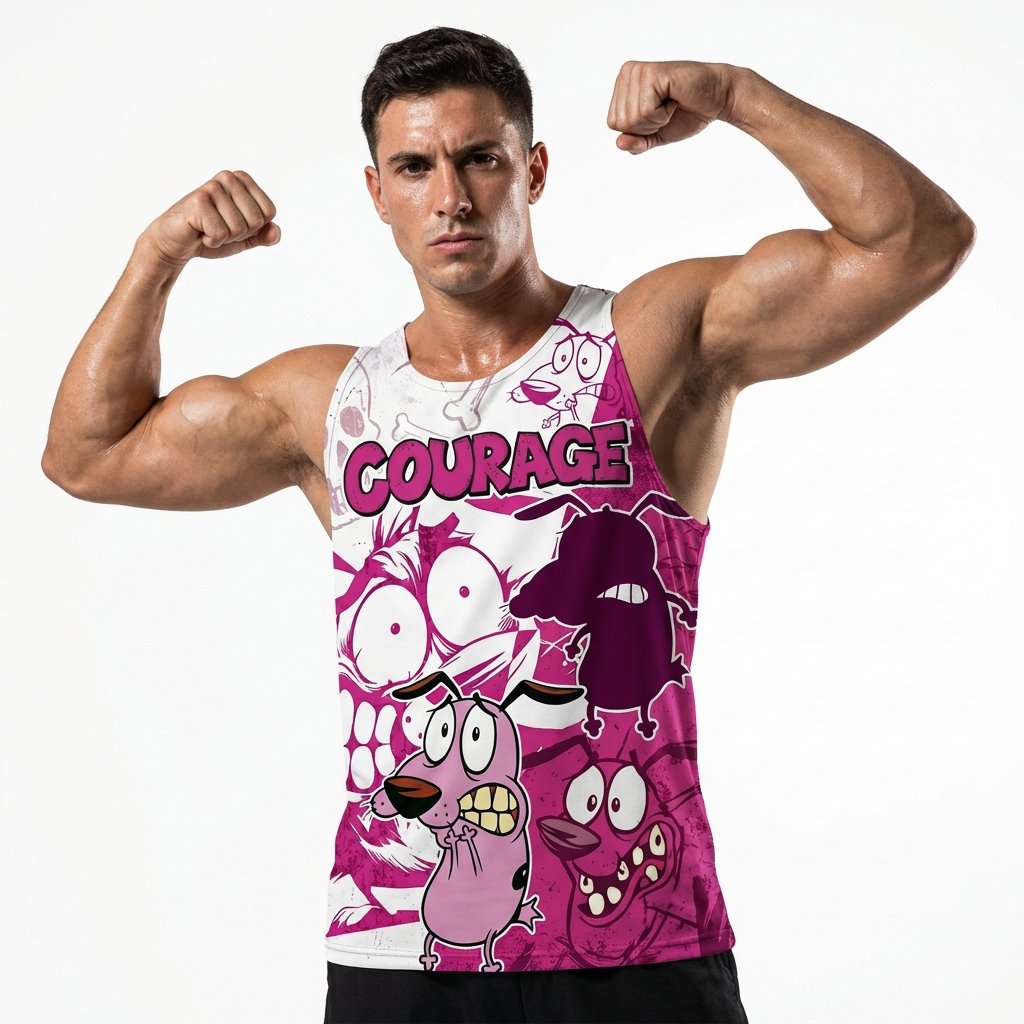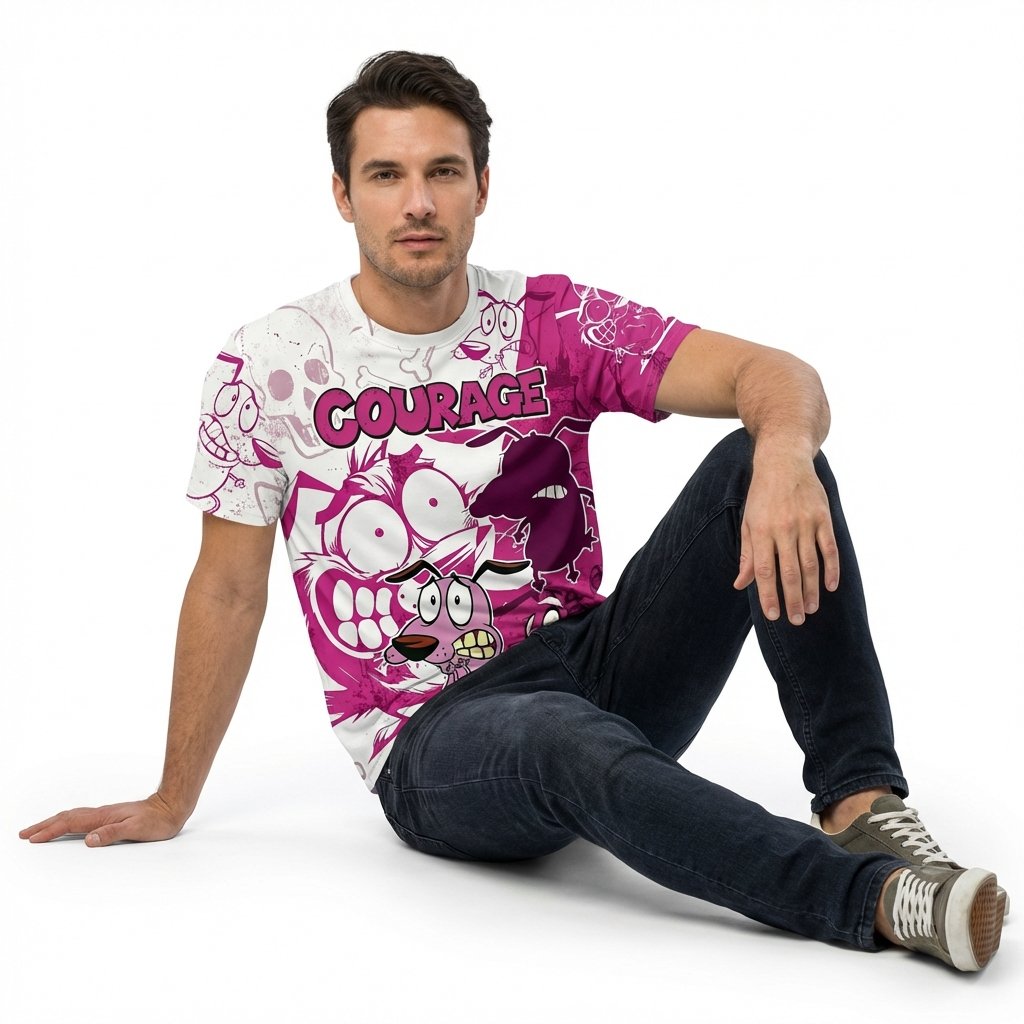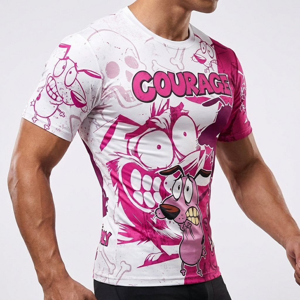 Remera premium de poliéster sublimada con diseño de Coraje el Perro Cobarde. Full Print con diseño split en fucsia y blanco, con ilustraciones icónicas de Coraje y calaveras. Incluye dorso con silueta de Coraje y el texto ‘THE COWARDLY DOG’.