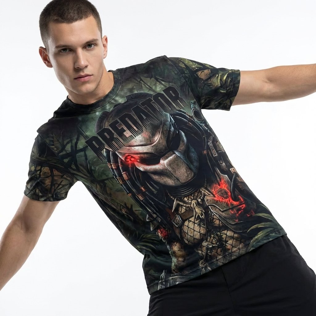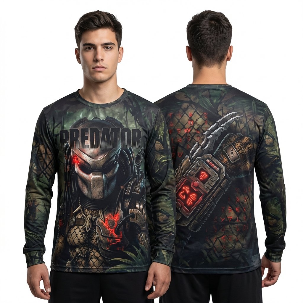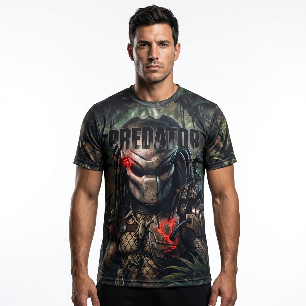 Remera premium de poliéster sublimada con el impactante diseño de Depredador (Predator). Full Print con el Jungle Hunter y su sistema de puntería láser al frente, y la computadora de muñeca (gauntlet) con glifos alienígenas incandescentes al dorso. Un diseño táctico y de ciencia ficción con camuflaje de selva de alta definición.