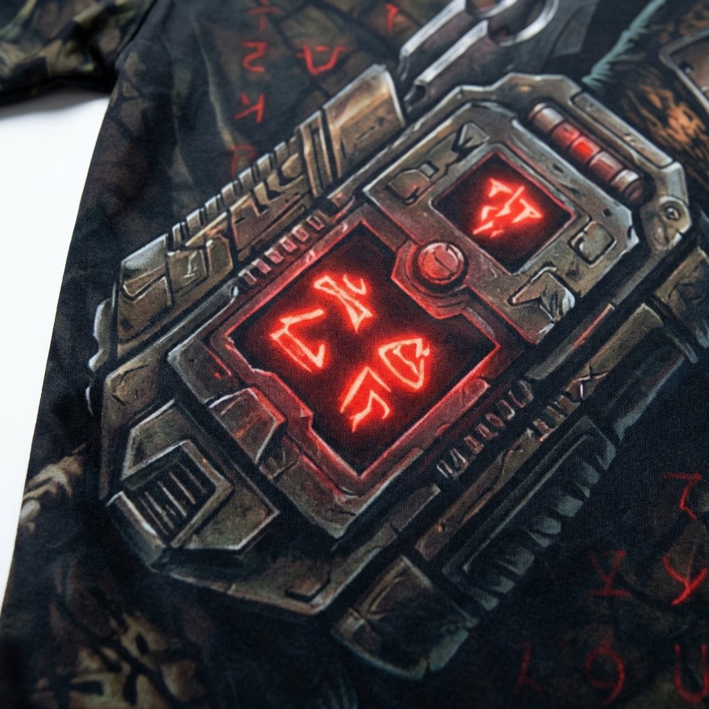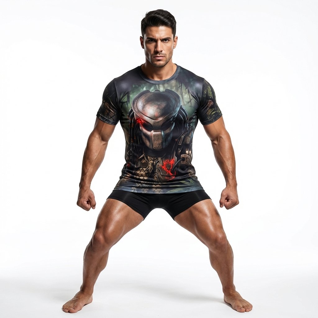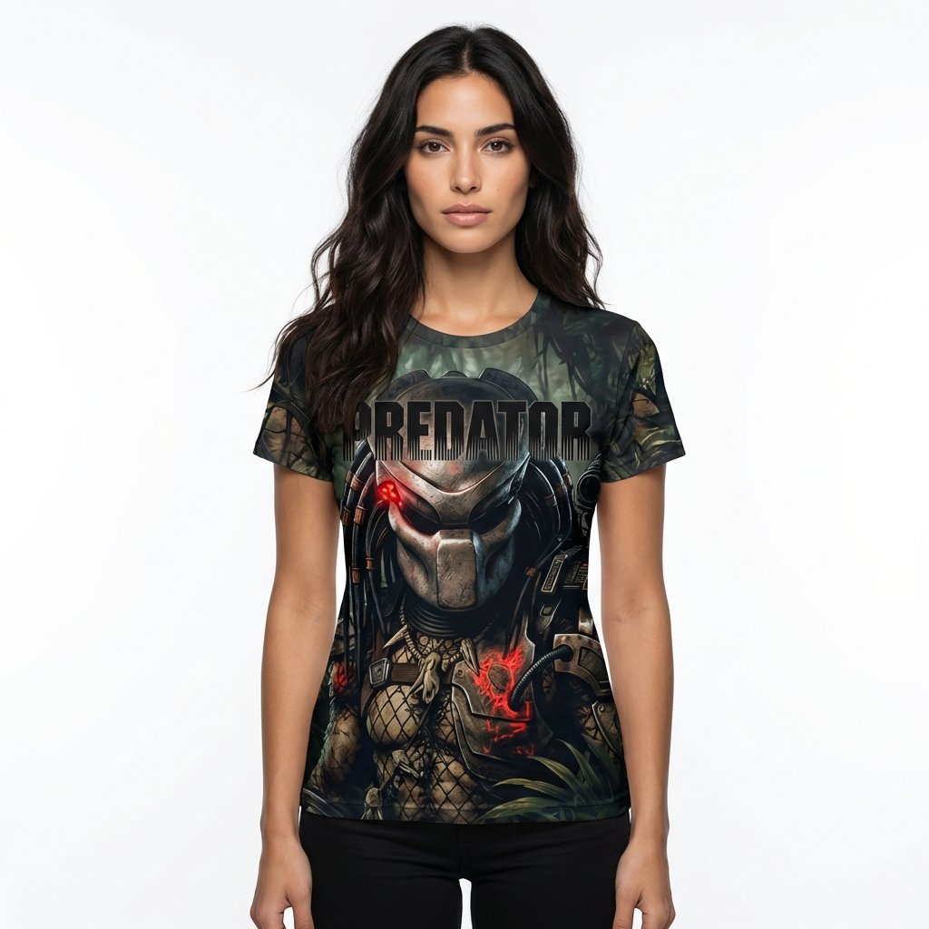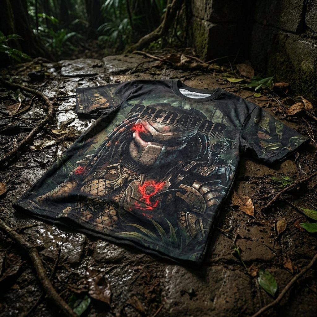 Remera premium de poliéster sublimada con el impactante diseño de Depredador (Predator). Full Print con el Jungle Hunter y su sistema de puntería láser al frente, y la computadora de muñeca (gauntlet) con glifos alienígenas incandescentes al dorso. Un diseño táctico y de ciencia ficción con camuflaje de selva de alta definición.