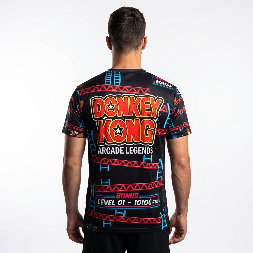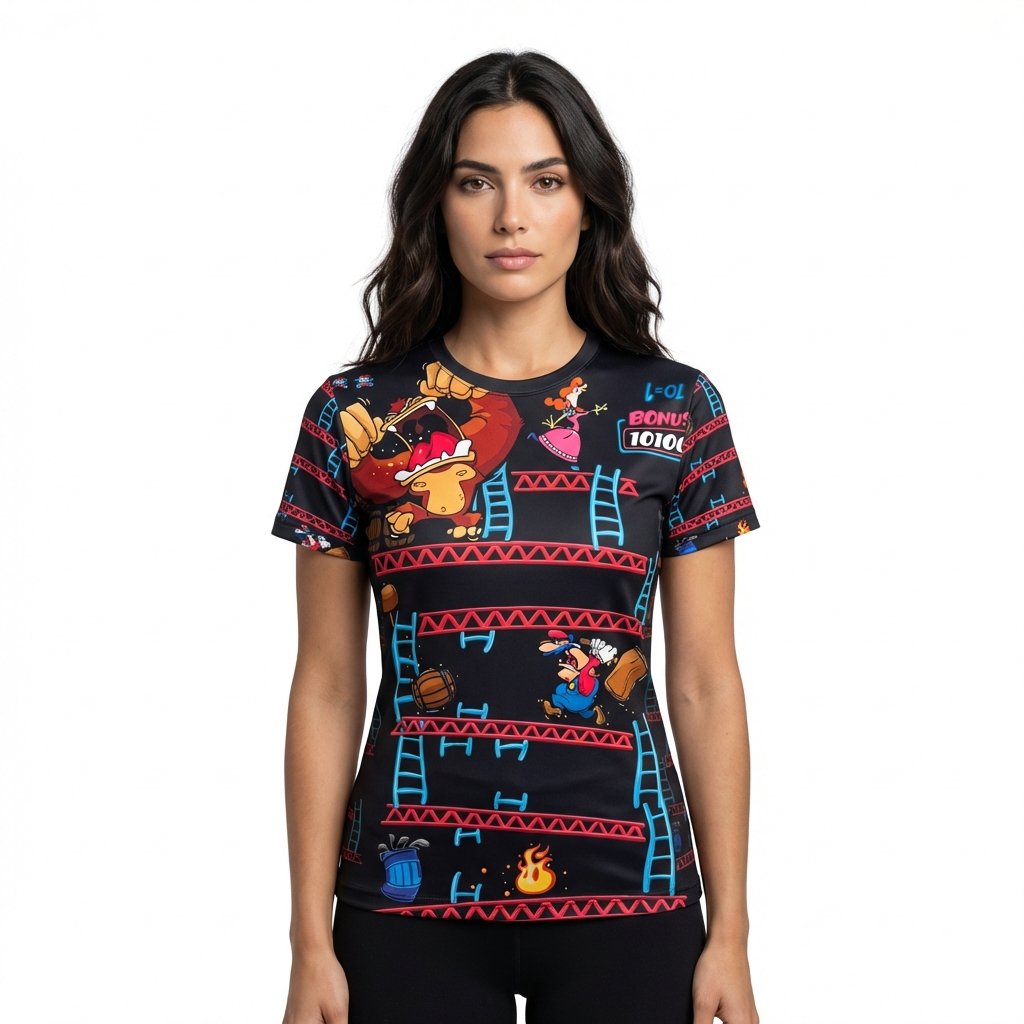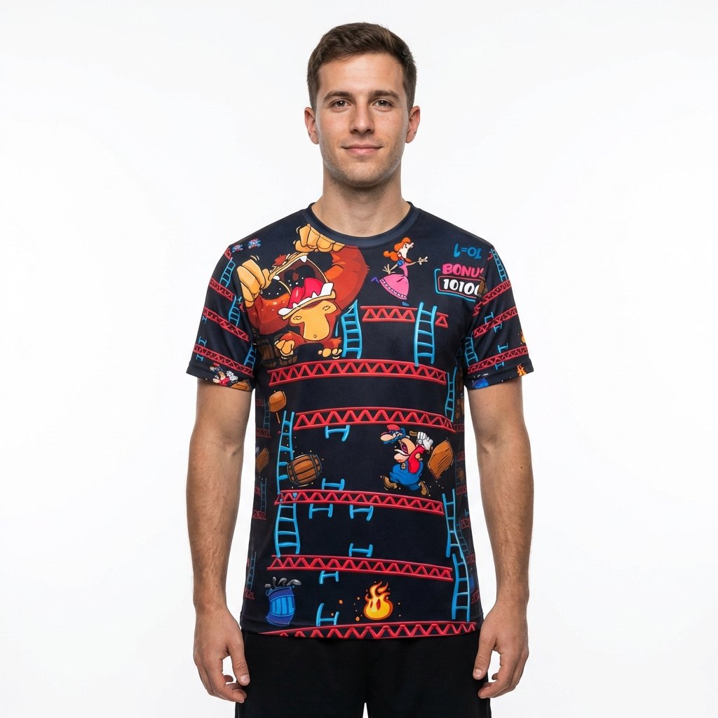 Remera premium de poliéster sublimada con el icónico nivel 1 del Donkey Kong original. Un tributo Full Print que incluye a DK, Mario (Jumpman), Pauline y las clásicas vigas y barriles. Lo último en nostalgia gamer estilo retro arcade.