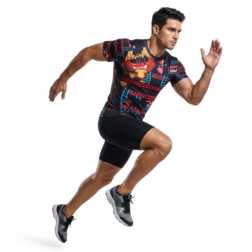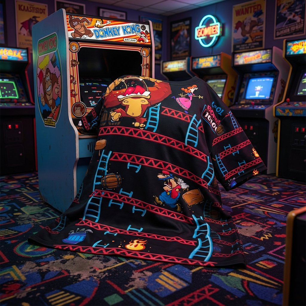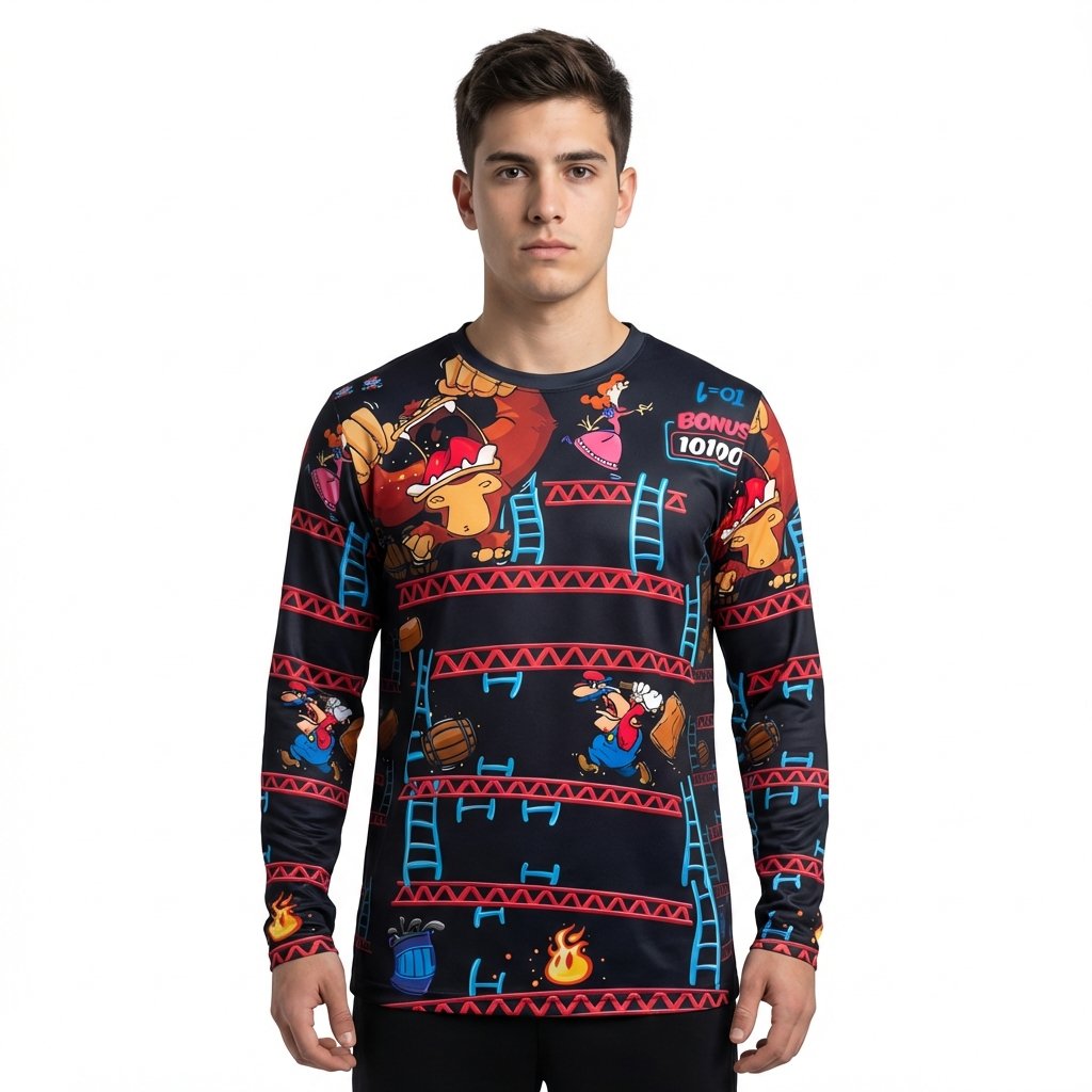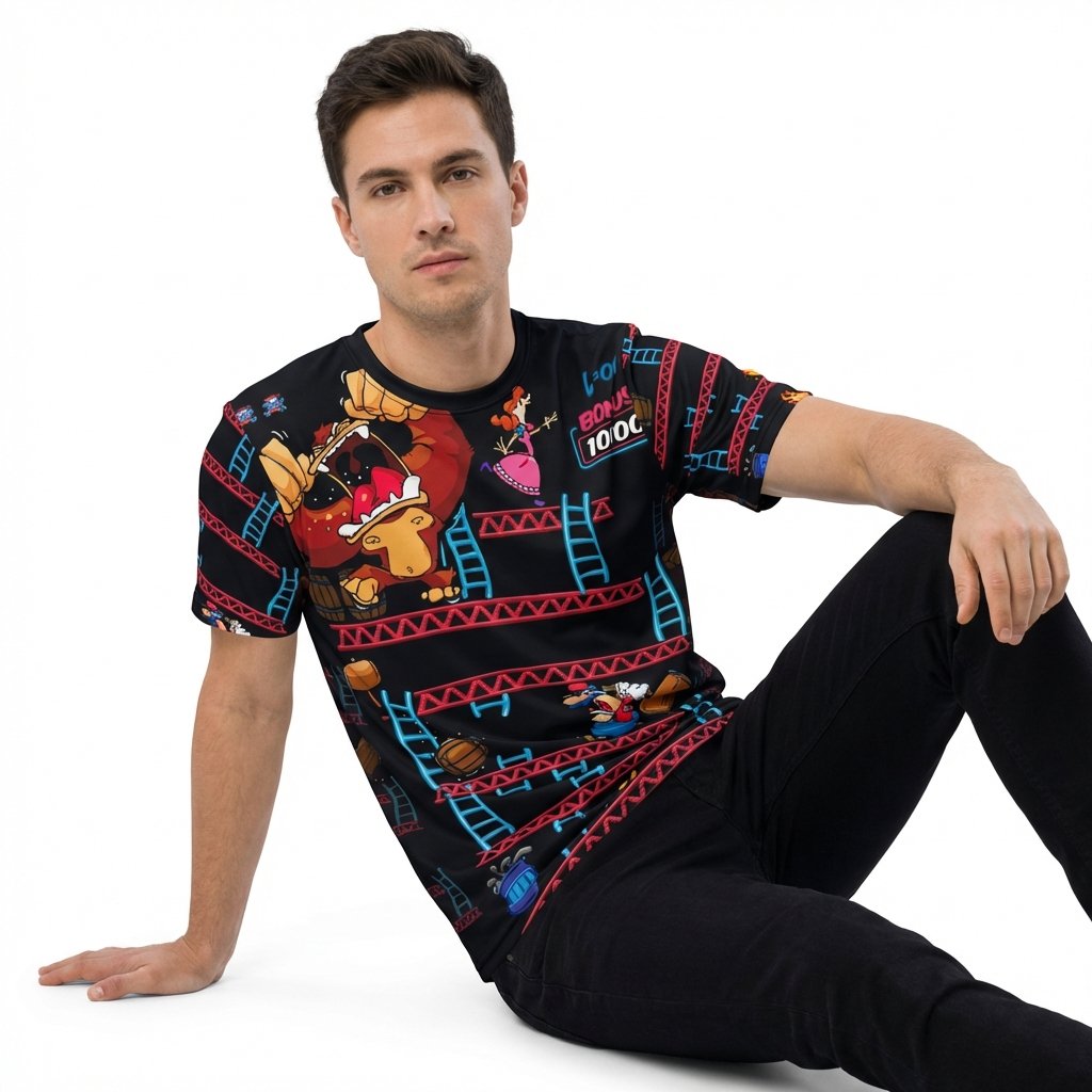 Remera premium de poliéster sublimada con el icónico nivel 1 del Donkey Kong original. Un tributo Full Print que incluye a DK, Mario (Jumpman), Pauline y las clásicas vigas y barriles. Lo último en nostalgia gamer estilo retro arcade.