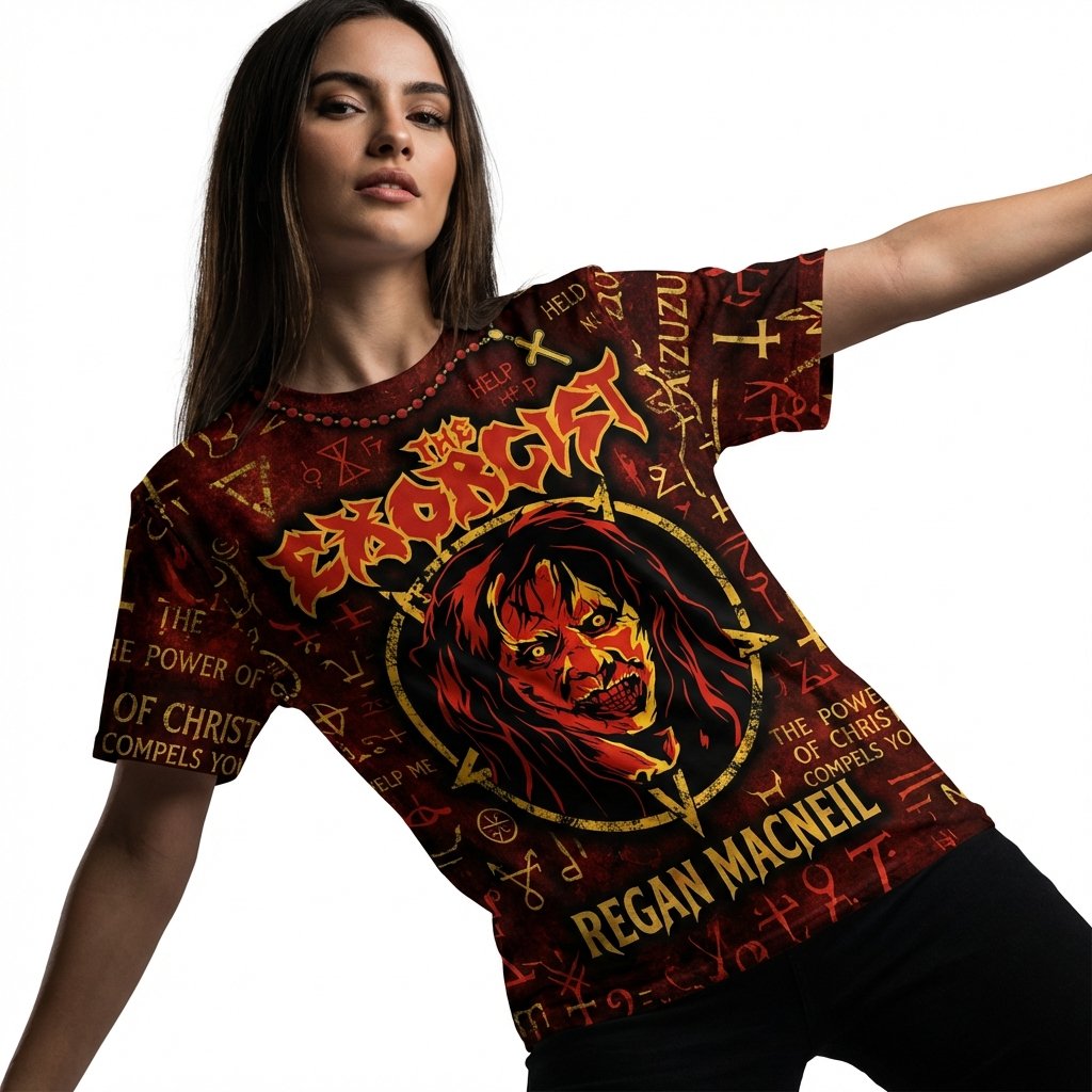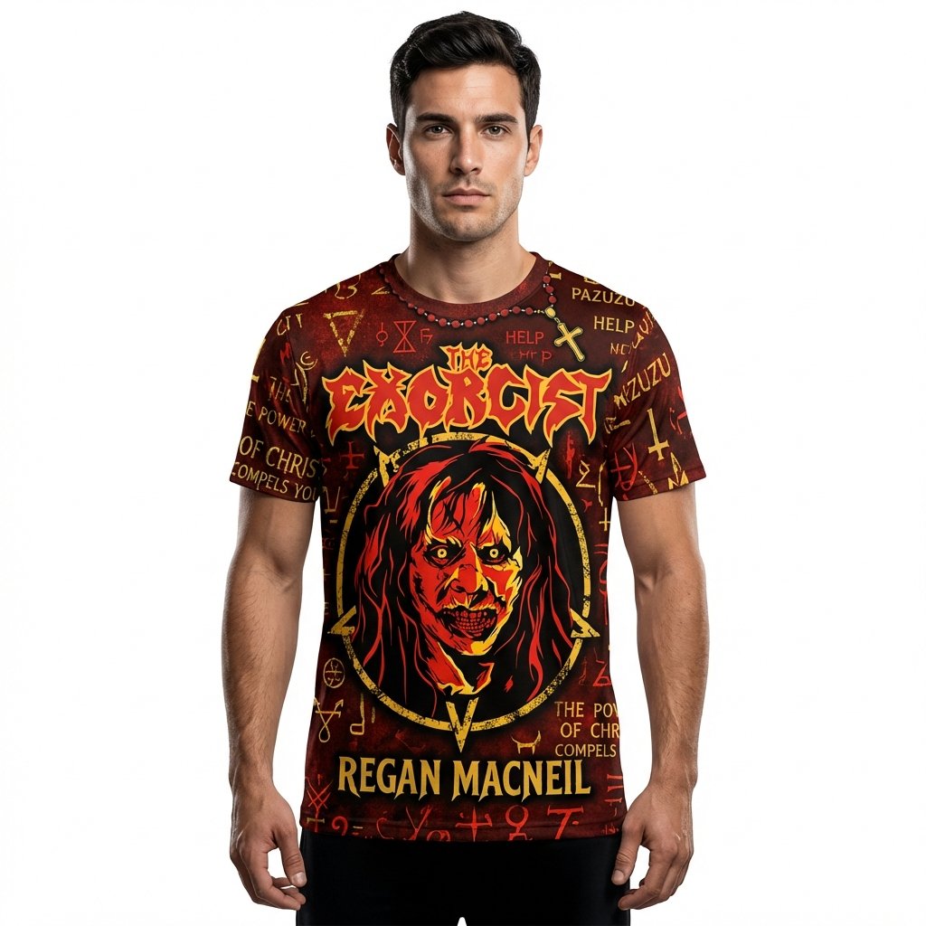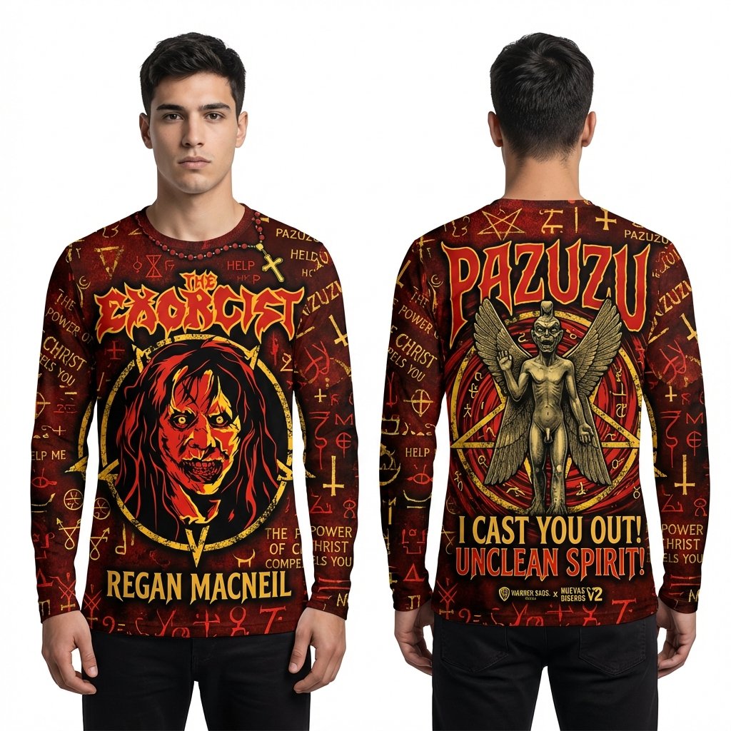 Remera premium de poliéster sublimada con el impactante diseño de El Exorcista. Full Print con el rostro poseído de Regan MacNeil al frente y la estatua de Pazuzu escoltada por símbolos ocultistas al dorso. Incluye la icónica frase: ‘I CAST YOU OUT! UNCLEAN SPIRIT!’. Un diseño terrorífico de alta calidad para verdaderos fans del género.