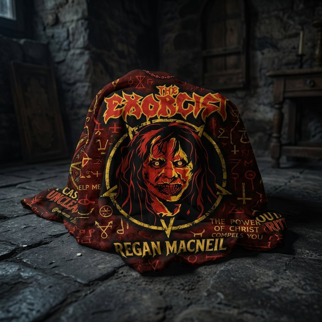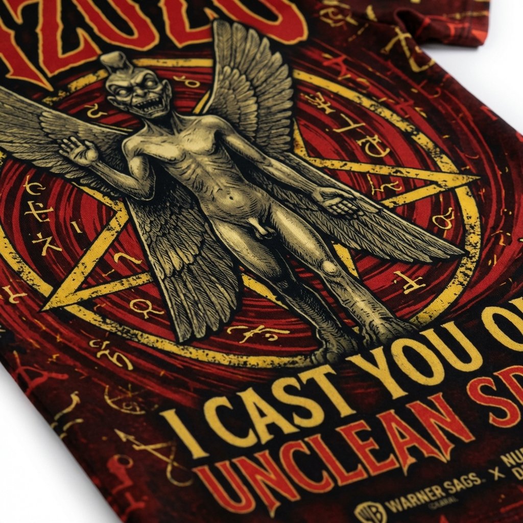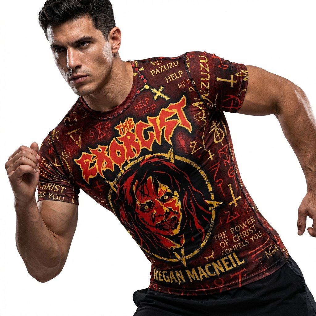 Remera premium de poliéster sublimada con el impactante diseño de El Exorcista. Full Print con el rostro poseído de Regan MacNeil al frente y la estatua de Pazuzu escoltada por símbolos ocultistas al dorso. Incluye la icónica frase: ‘I CAST YOU OUT! UNCLEAN SPIRIT!’. Un diseño terrorífico de alta calidad para verdaderos fans del género.