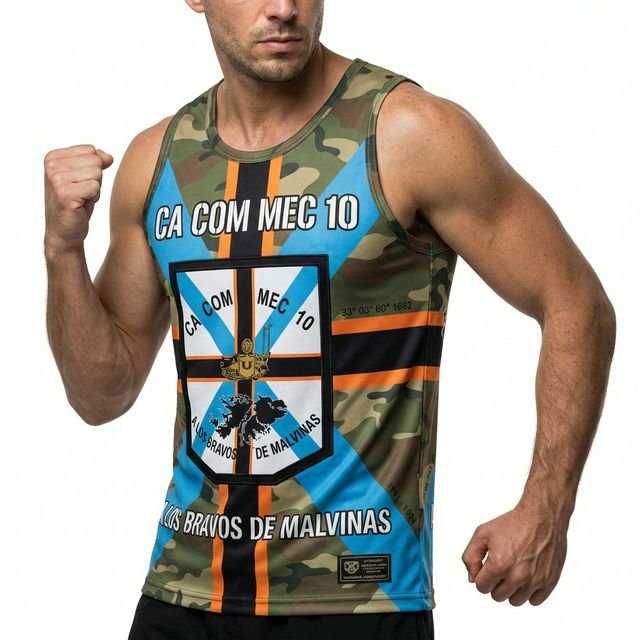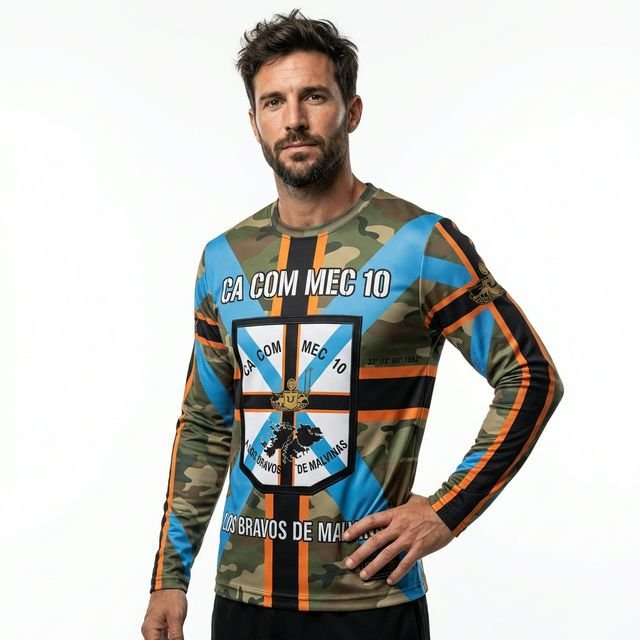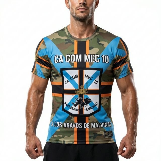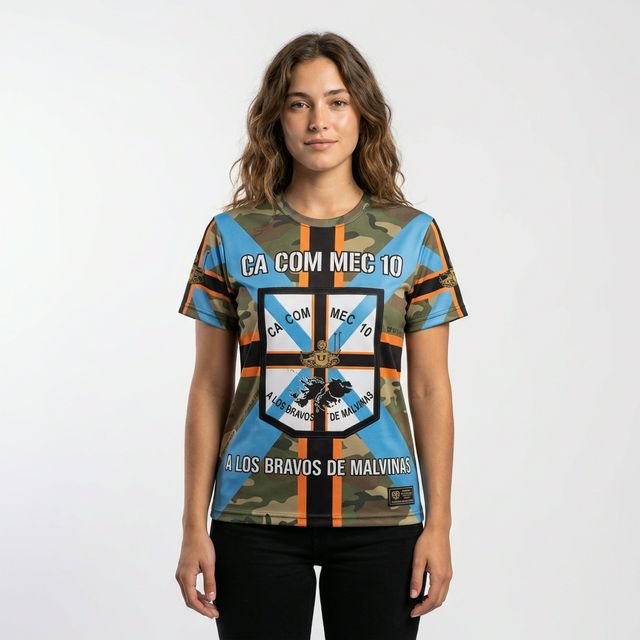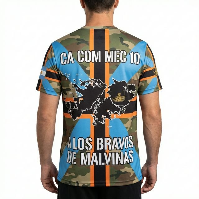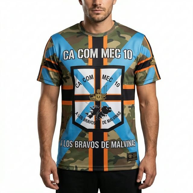 Remera premium con diseño de Malvinas CA COM MEC 10 (Compañía de Comunicaciones Mecanizada 10). Confeccionada en tela de alta calidad con técnica de sublimación total (Full Print). Diseño woodland camouflage con cruz celeste, franjas naranjas y escudo central con silueta de las Islas Malvinas y texto “A LOS BRAVOS DE MALVINAS”.