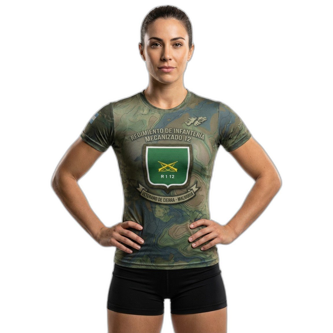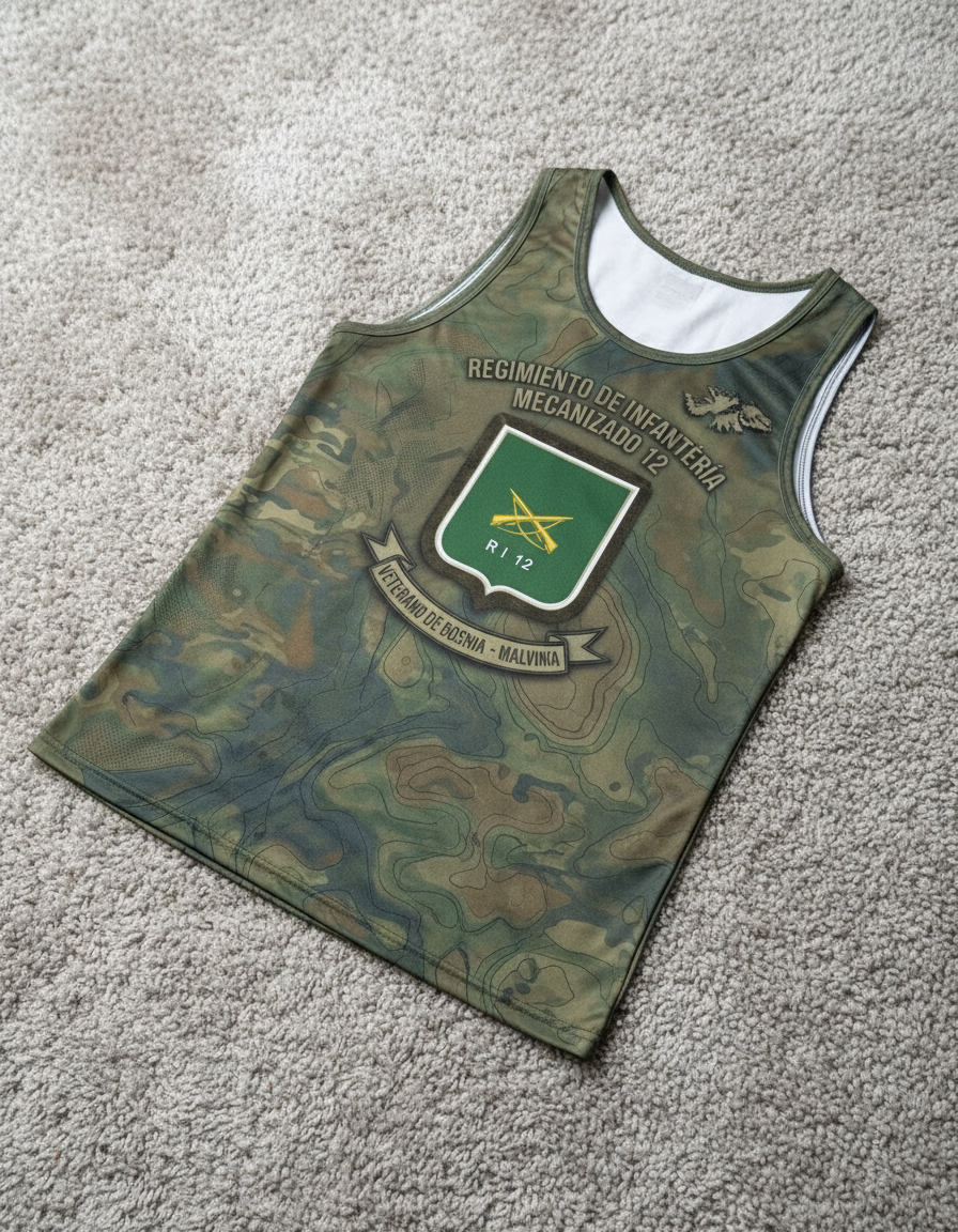 – **Gráficos de Alta Calidad:** La parte frontal presenta el icónico emblema del Regimiento Mecanizado RI 12, estampado con tintas eco-amigables y resistentes al desgaste, asegurando que se mantenga vibrante tras cada lavado.
