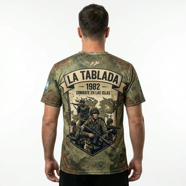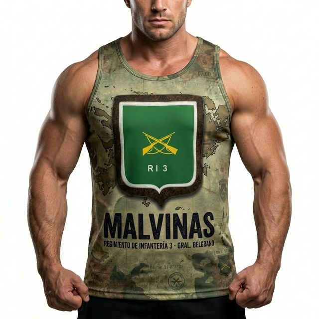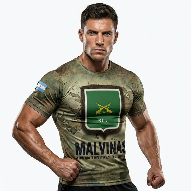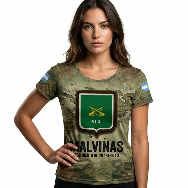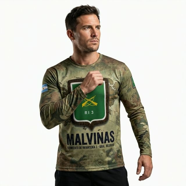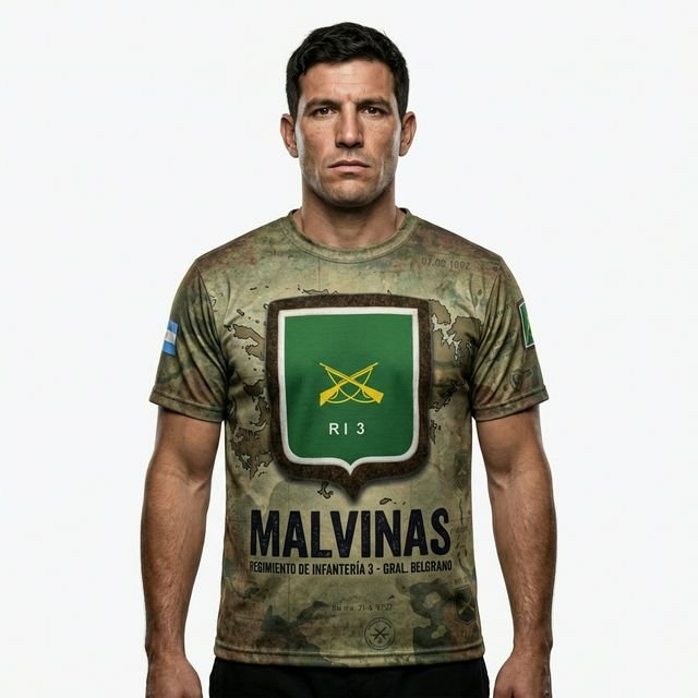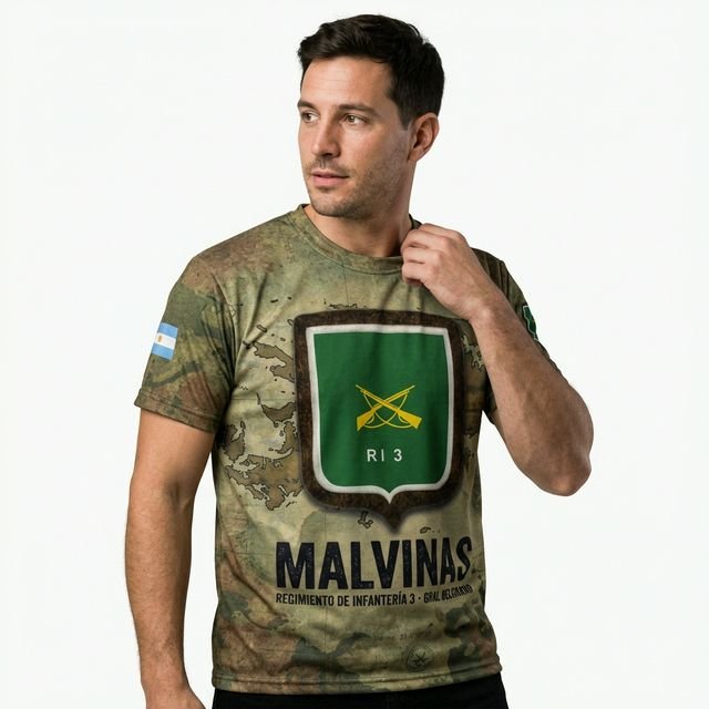 Remera premium con diseño de Malvinas RI 3 (Regimiento de Infantería 3 – Gral. Belgrano). Confeccionada en tela de alta calidad con técnica de sublimación total (Full Print). Diseño woodland camouflage con escudo RI 3, texto MALVINAS y bandera argentina en la manga.