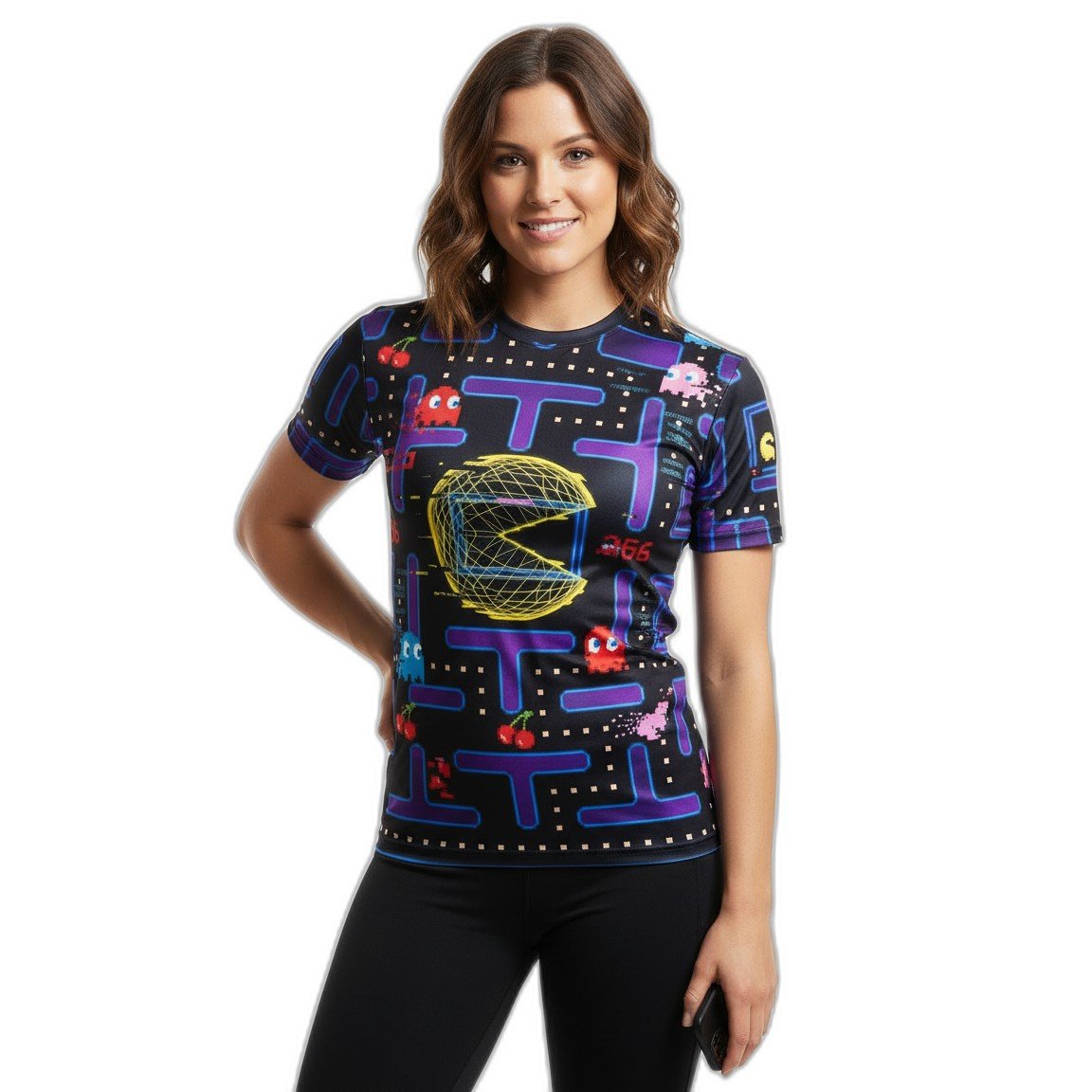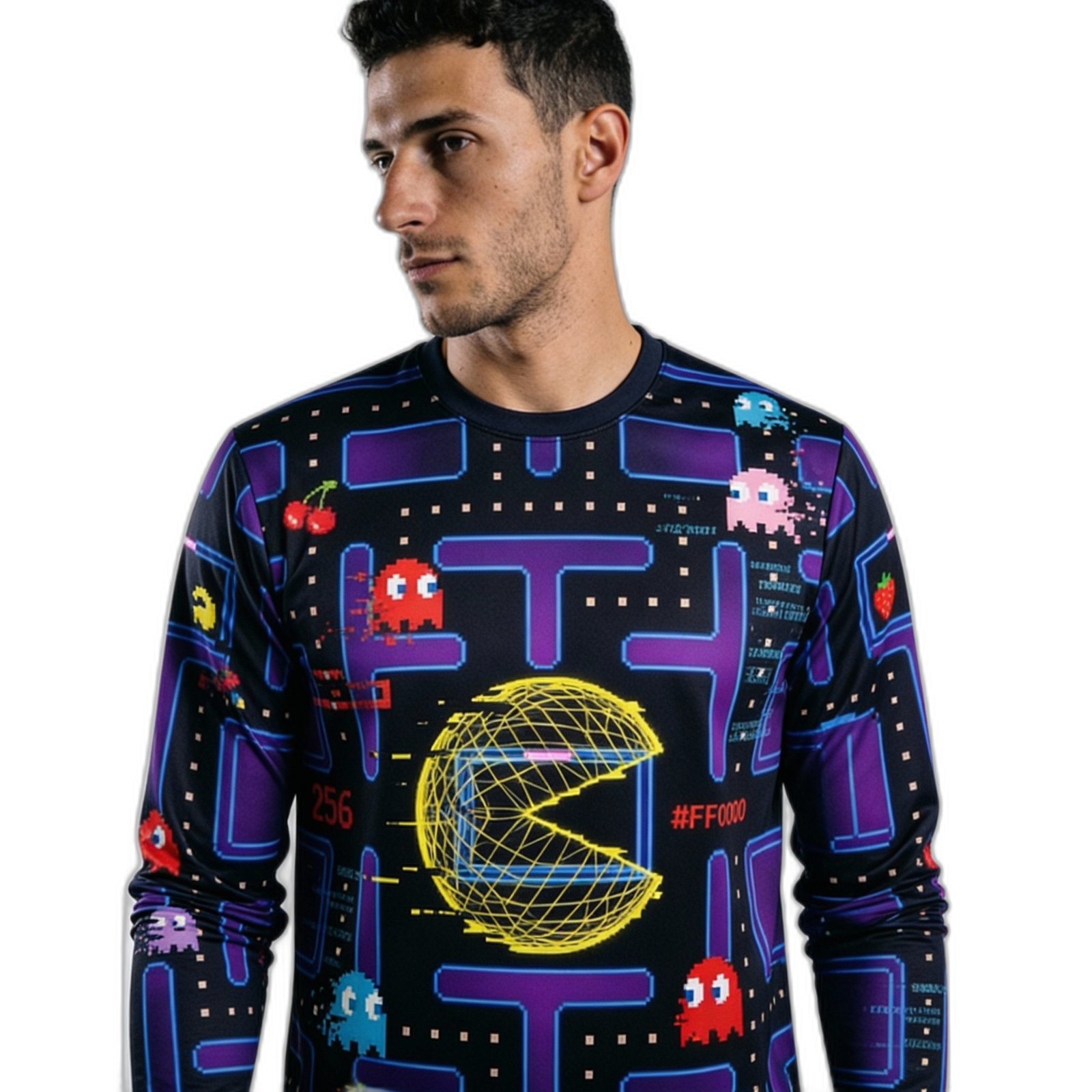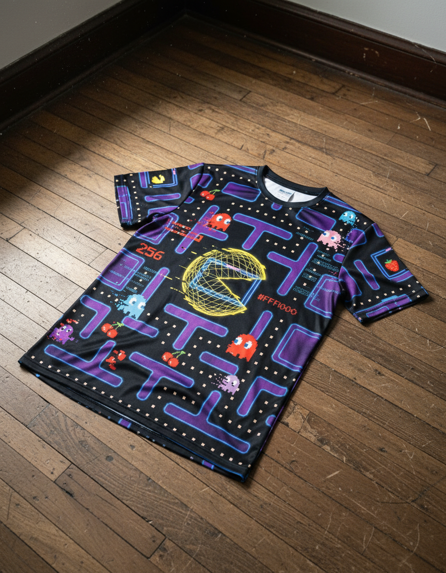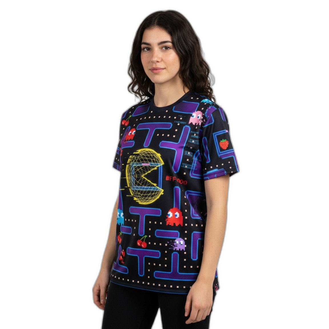 – **Diseño icónico:** La remera presenta un vibrante estampado de los legendarios fantasmas de Pac-man —Blinky, Pinky, Inky y Clyde— en un colorido diseño que captura la esencia del juego clásico.