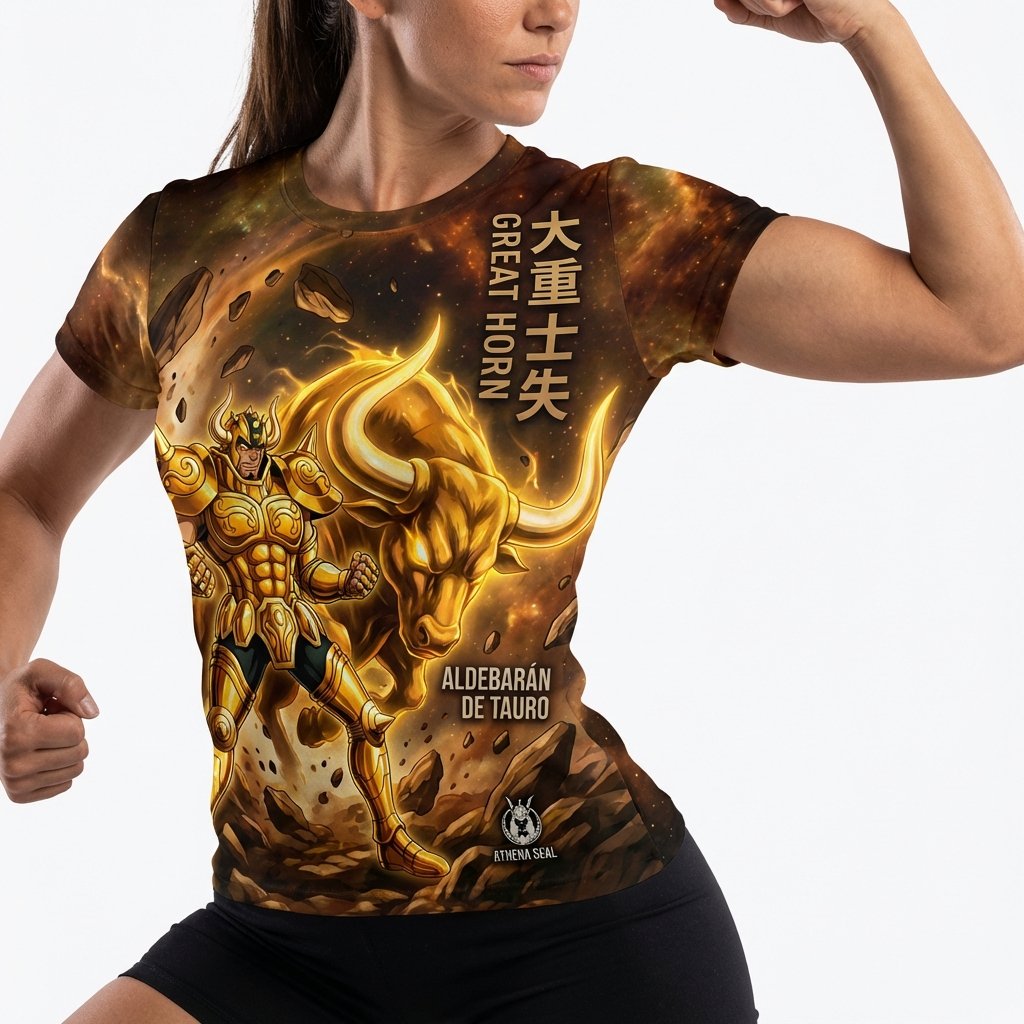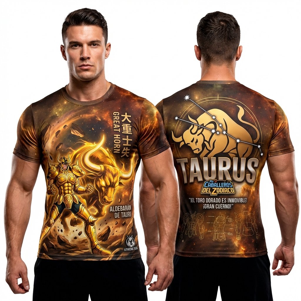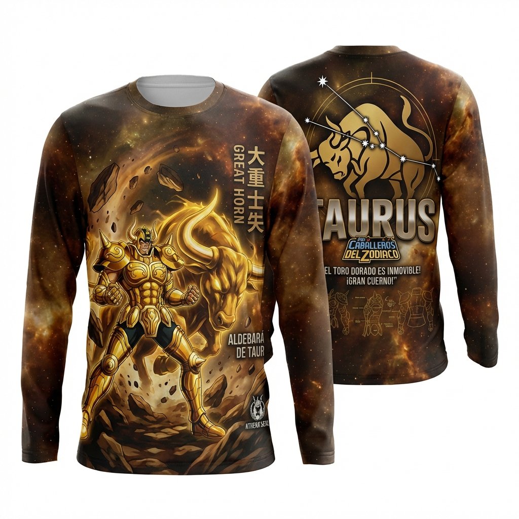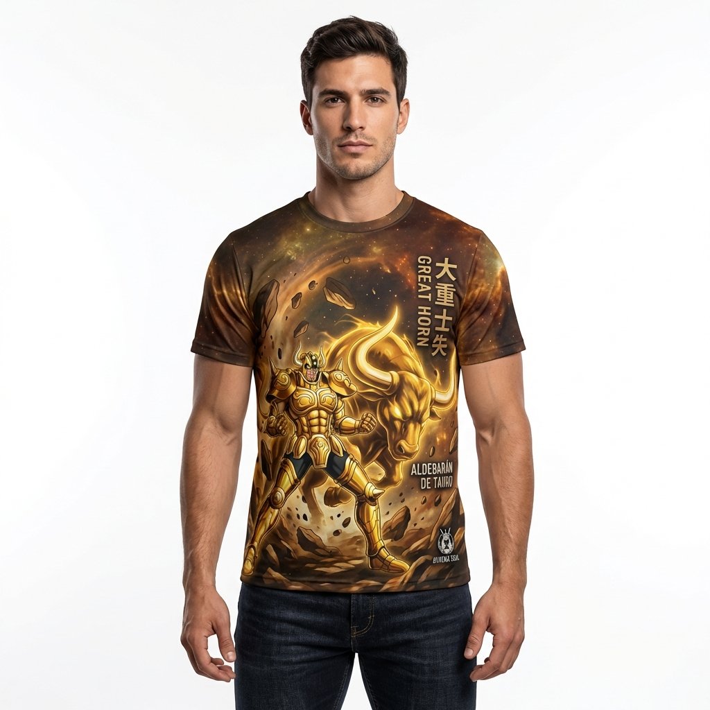 Remera premium de poliéster sublimada con diseño de Aldebarán de Tauro de Saint Seiya. Full Print con fondo de galaxia y diseño de armadura dorada.