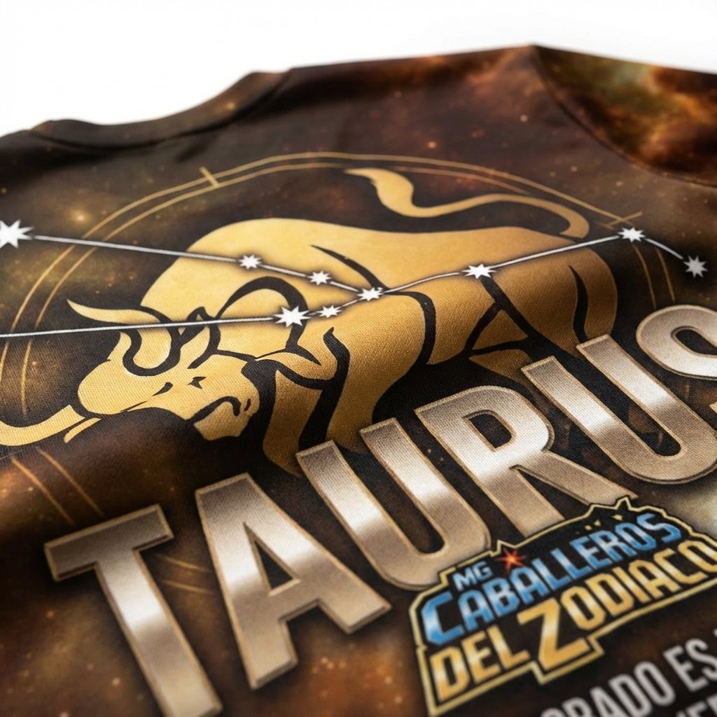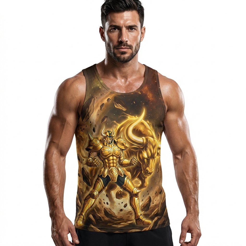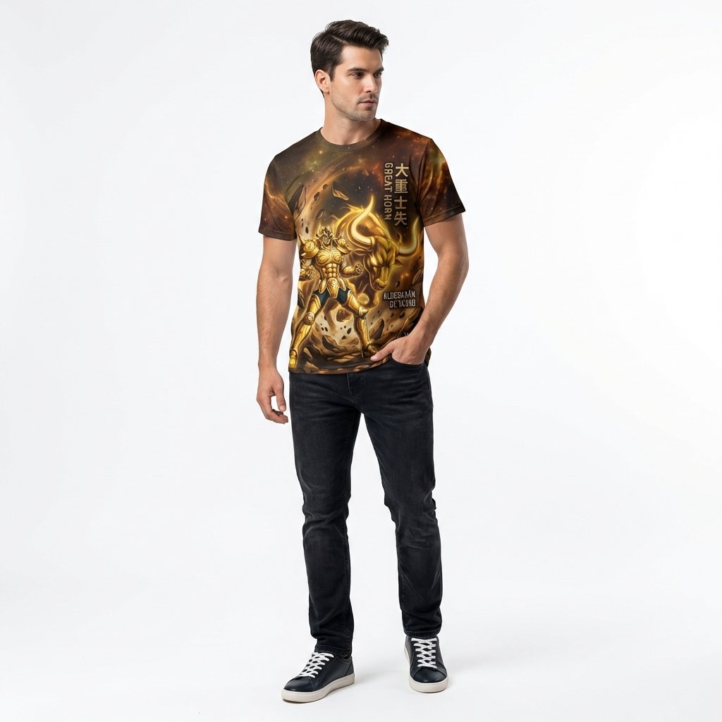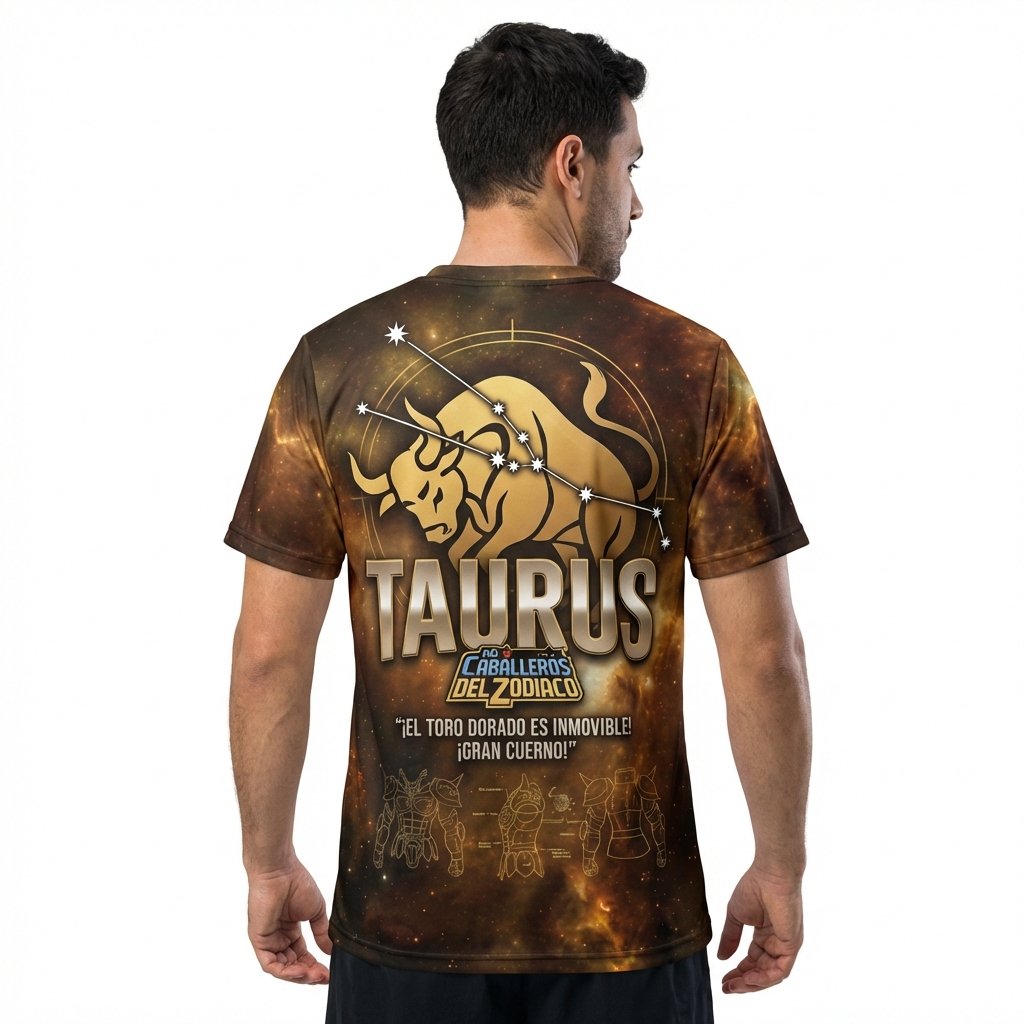 Remera premium de poliéster sublimada con diseño de Aldebarán de Tauro de Saint Seiya. Full Print con fondo de galaxia y diseño de armadura dorada.