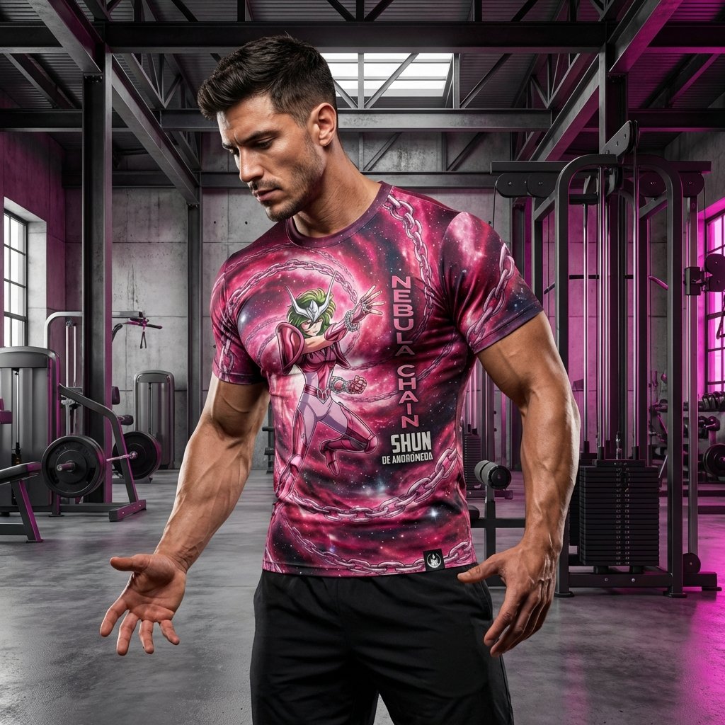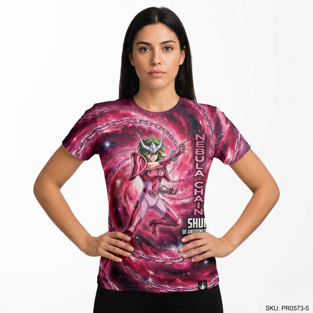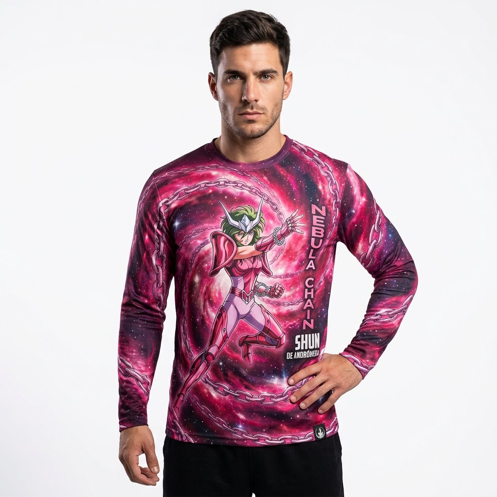 Remera con diseño exclusivo de Saint Seiya Andrómeda Shun. Calidad premium con técnica de sublimación total.