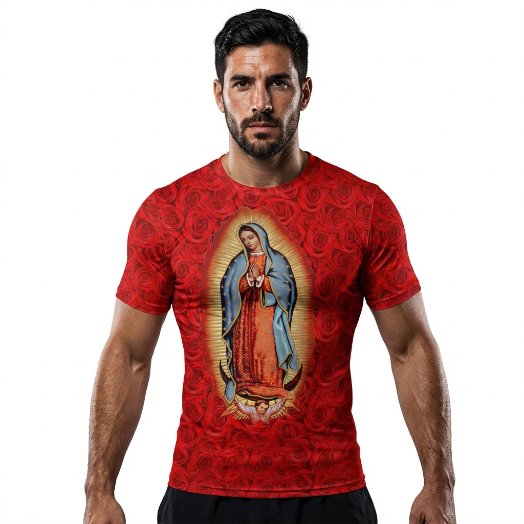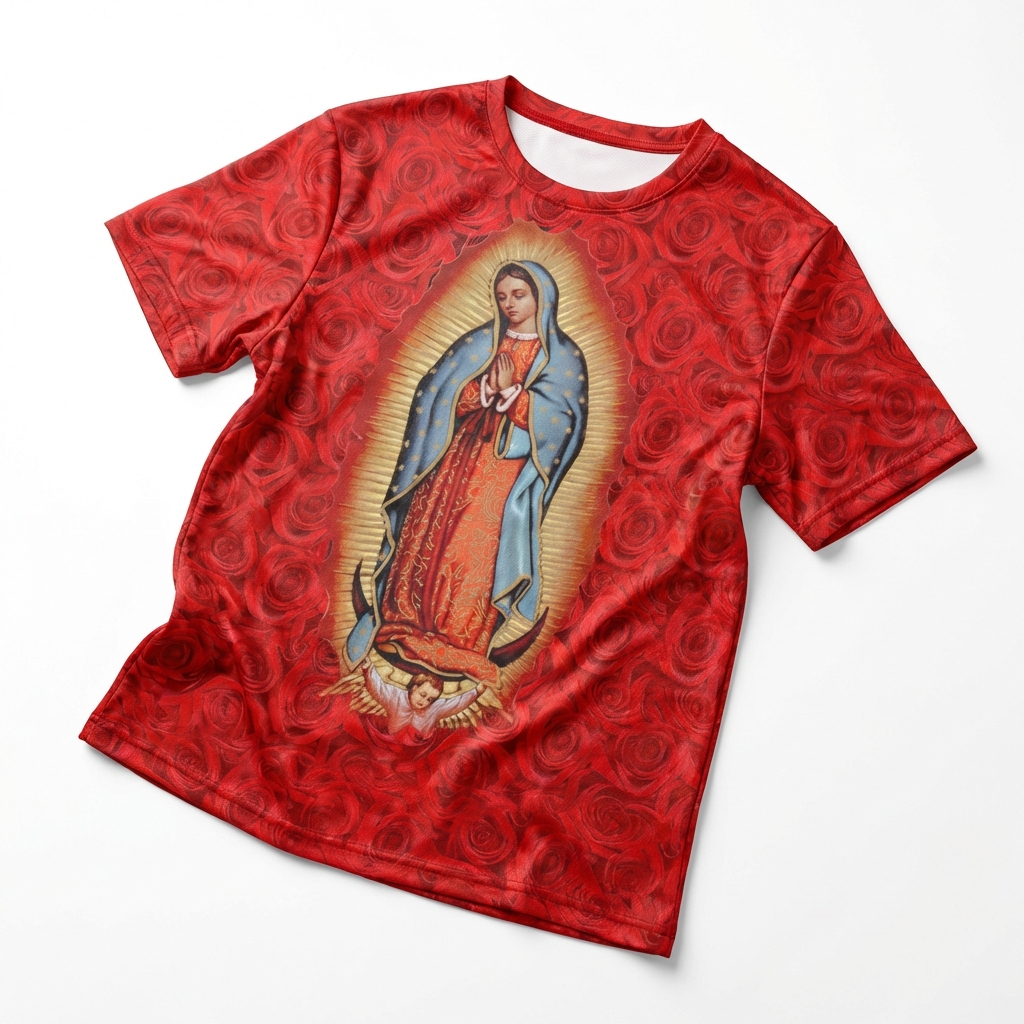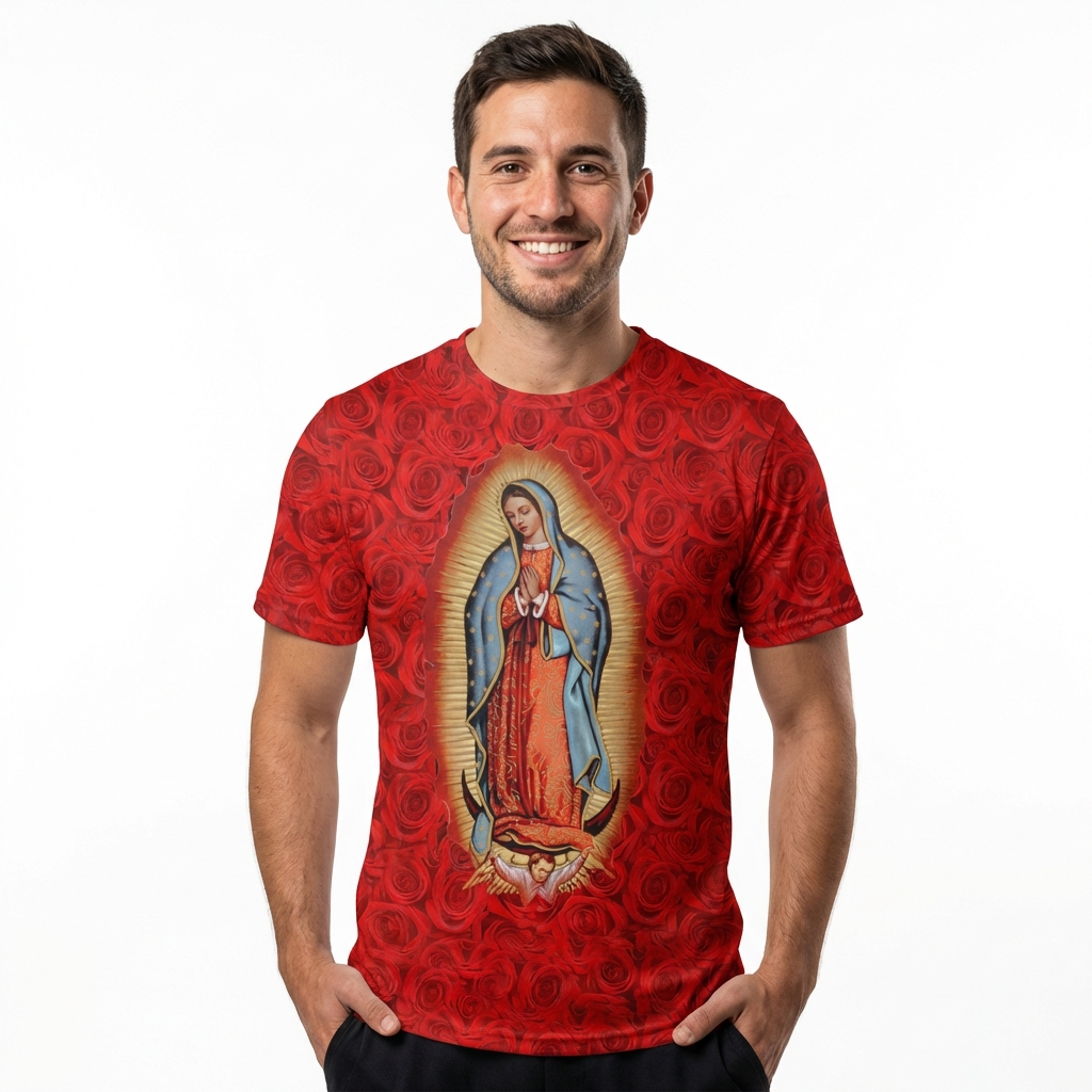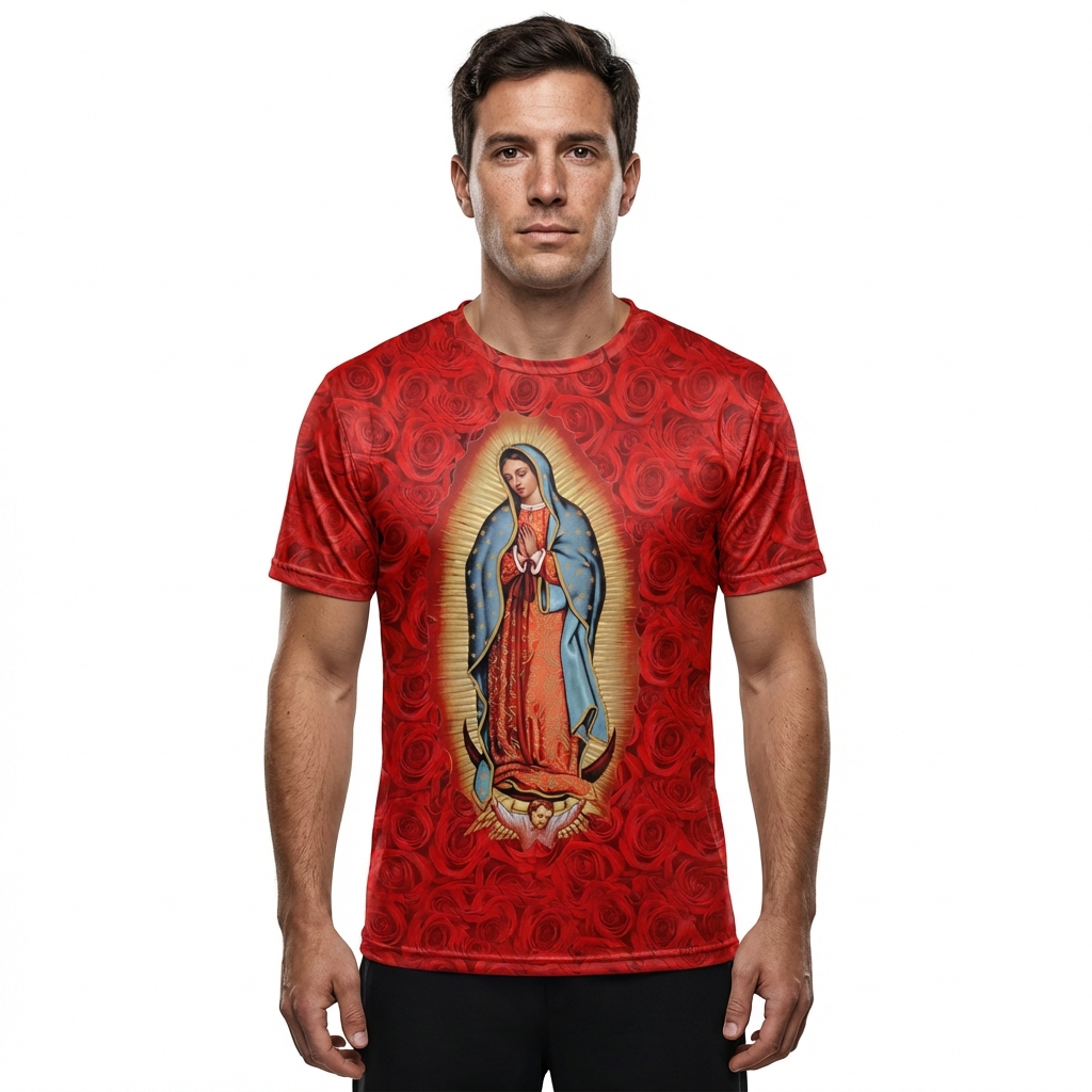 Remera premium con diseño artístico de la Virgen de Guadalupe y un patrón denso de rosas rojas. Fabricada en poliéster dry-fit de alta gama con técnica de sublimación total All-Over.