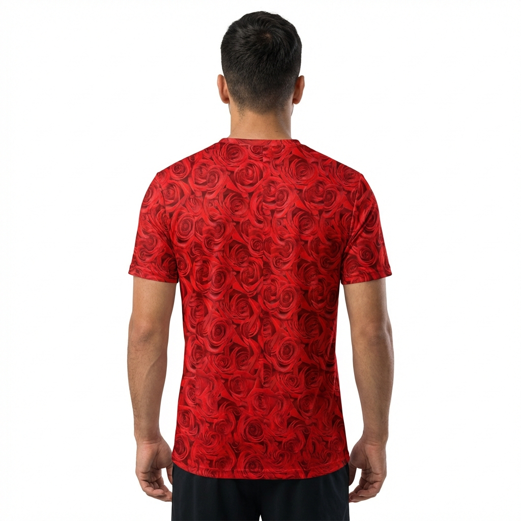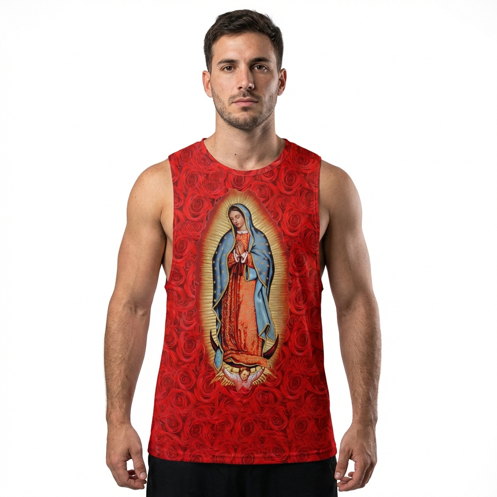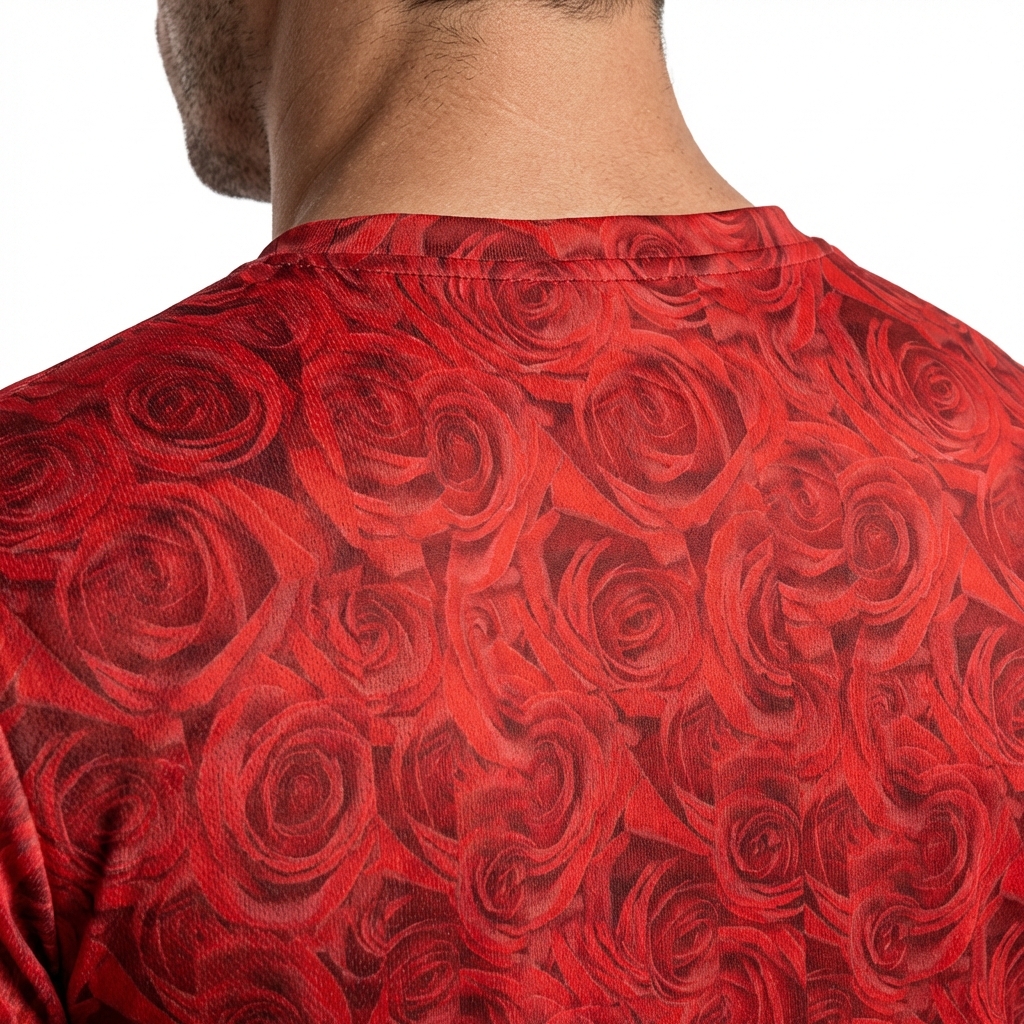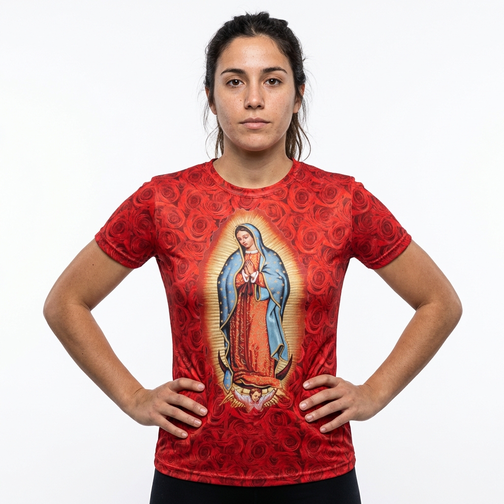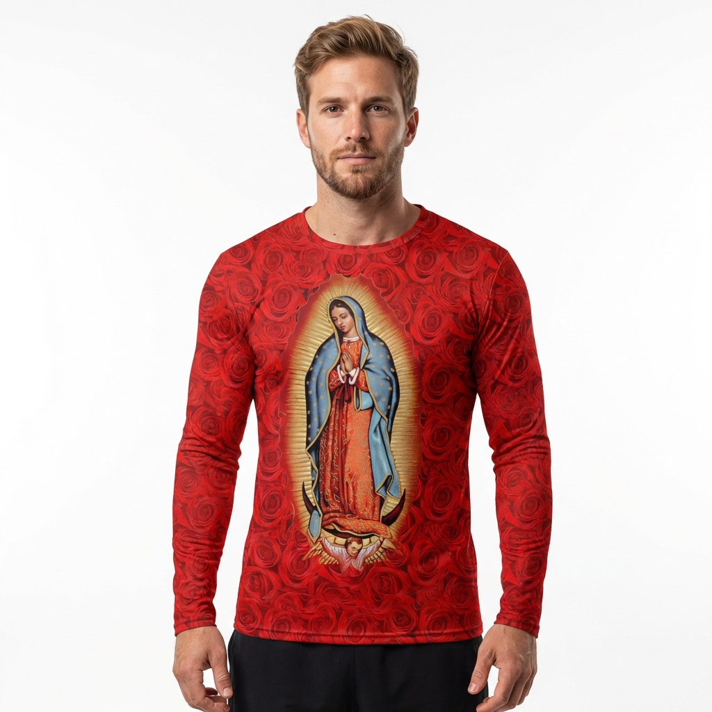 Remera premium con diseño artístico de la Virgen de Guadalupe y un patrón denso de rosas rojas. Fabricada en poliéster dry-fit de alta gama con técnica de sublimación total All-Over.