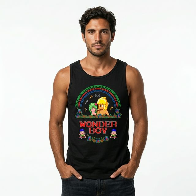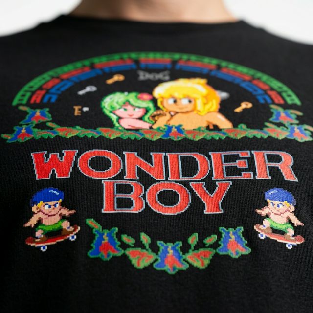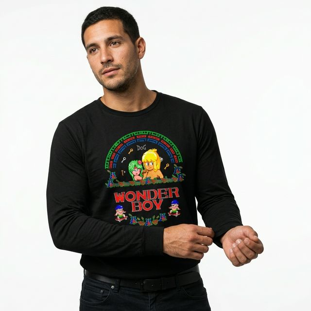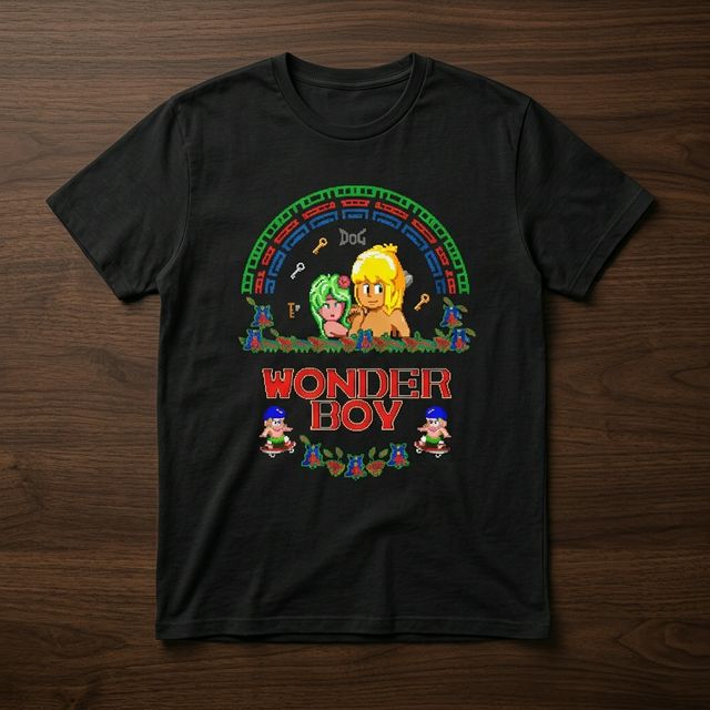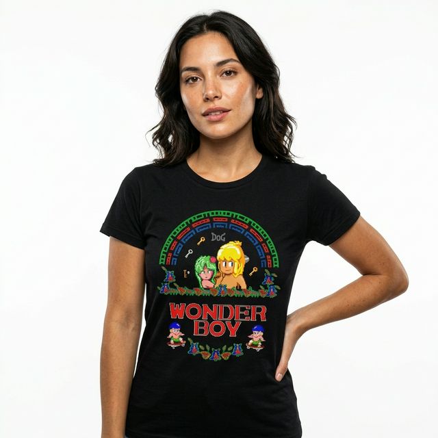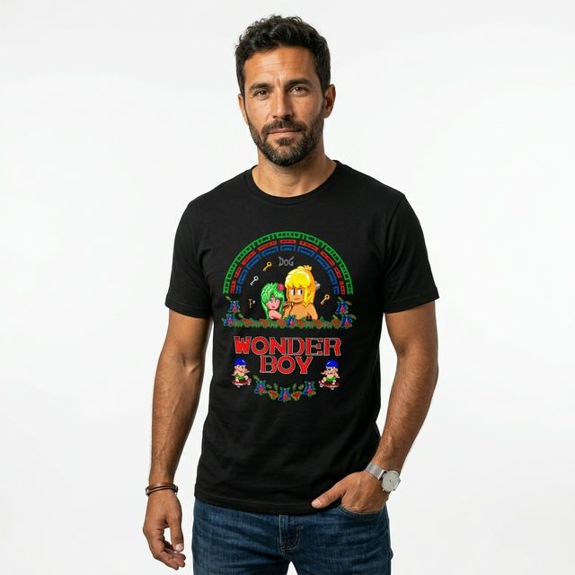 Remera de algodón premium con estampado DTF de Wonder Boy. Diseño retro pixel art del clásico de SEGA con los personajes principales y el icónico arco de colores. Estampado de alta definición con colores vibrantes y durabilidad superior.