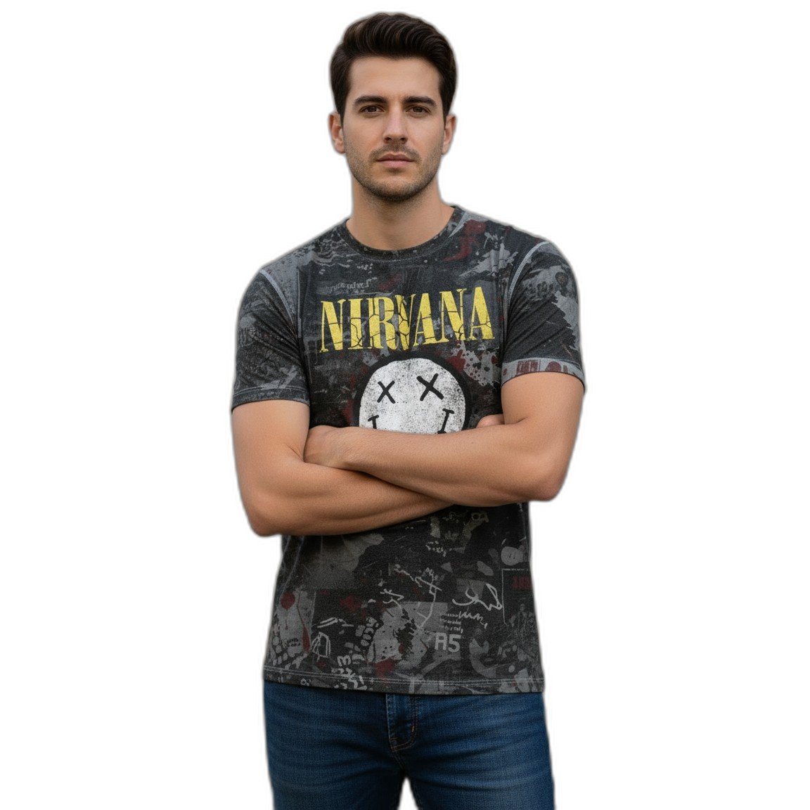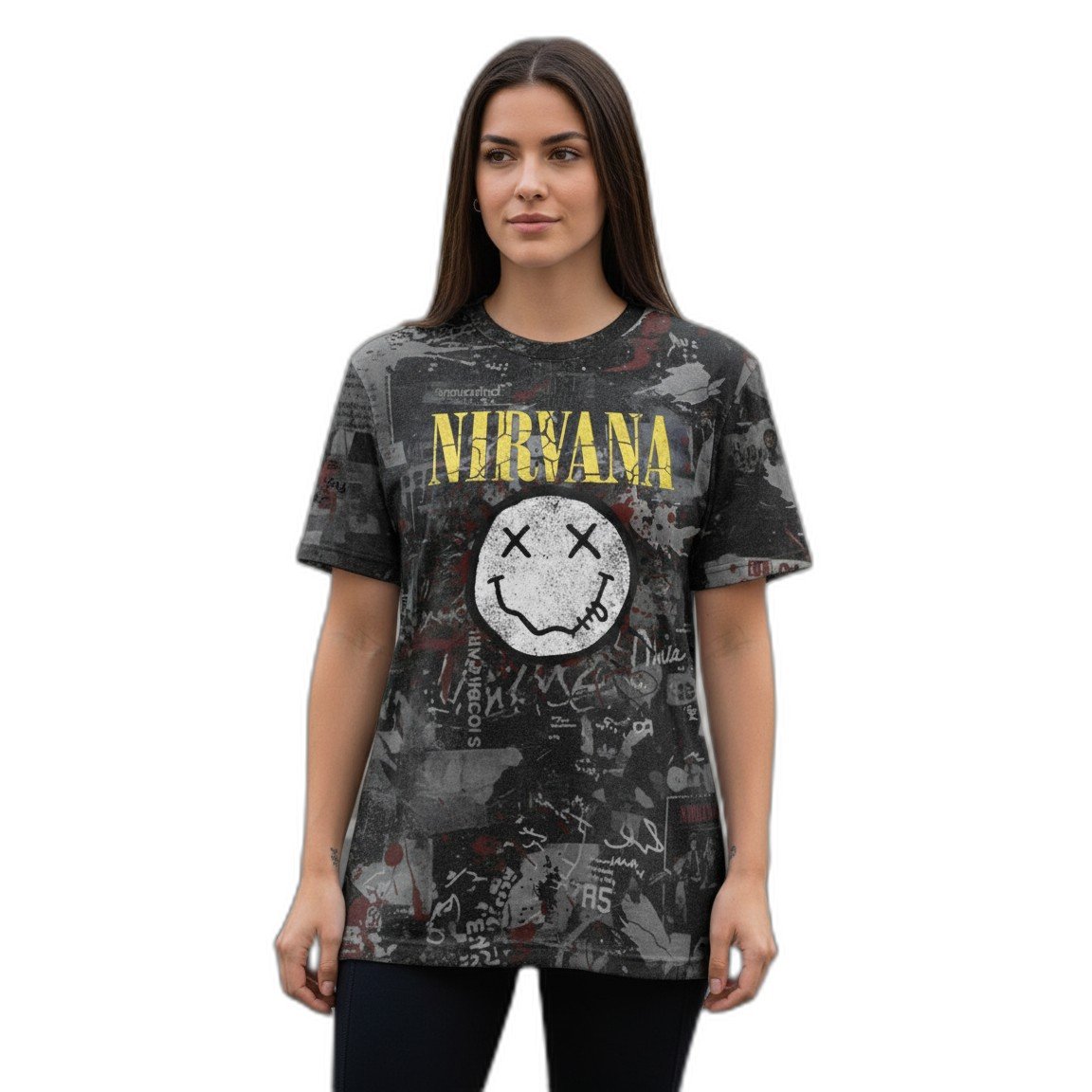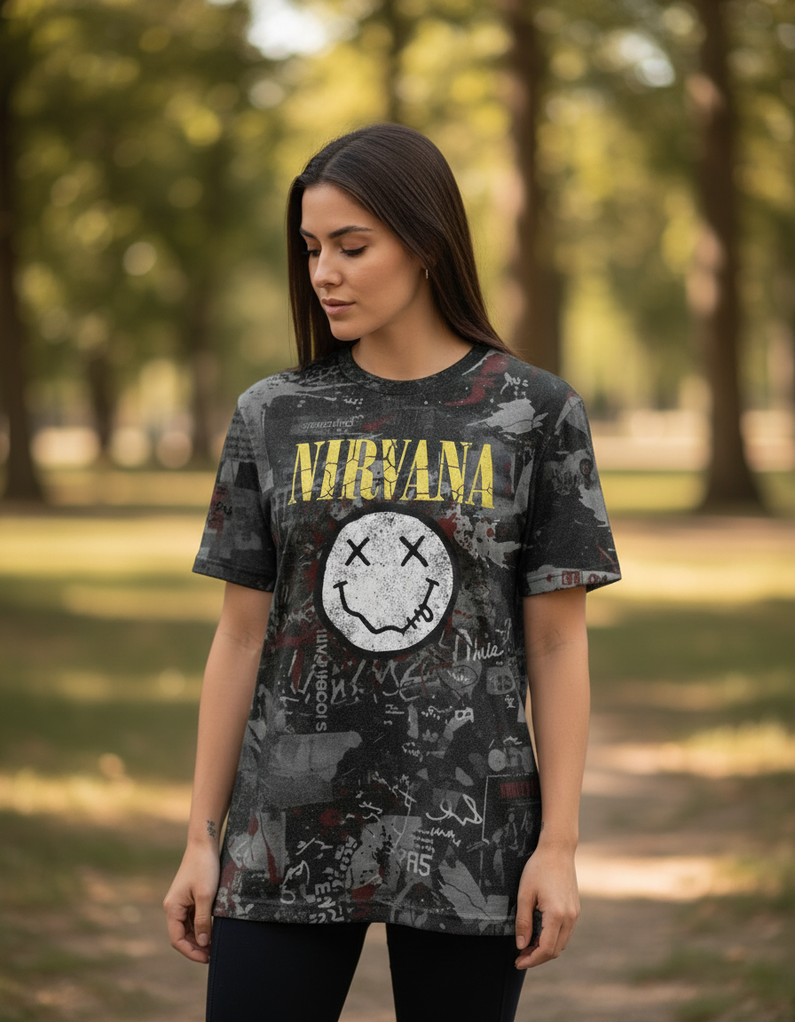 El emblemático logo de Nirvana, con su famoso smiley face, se despliega audazmente en el centro, creando un punto focal que atrapa todas las miradas. La impresión vintage da un toque desgastado que añade autenticidad y carácter, perfecto para cualquier amante del rock.