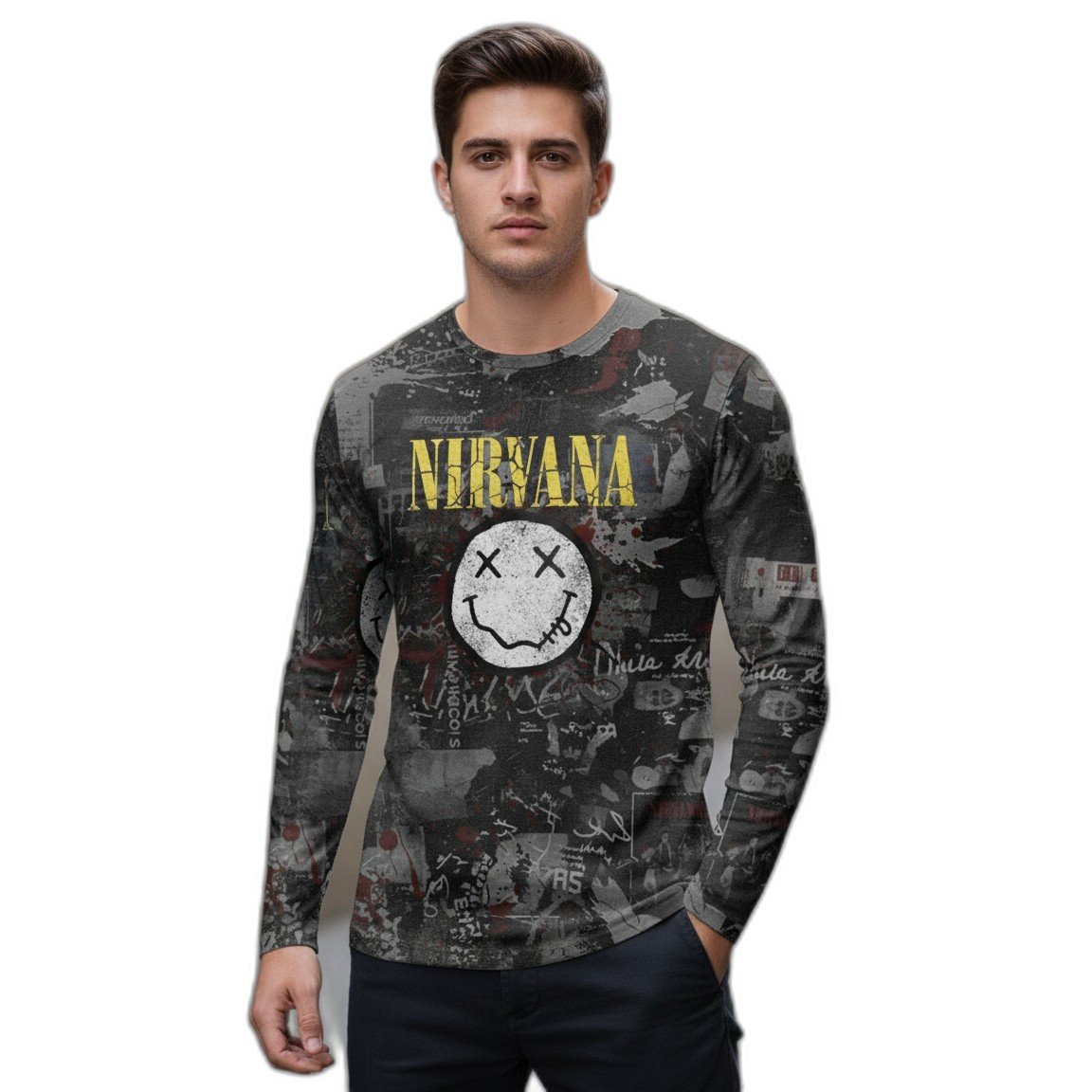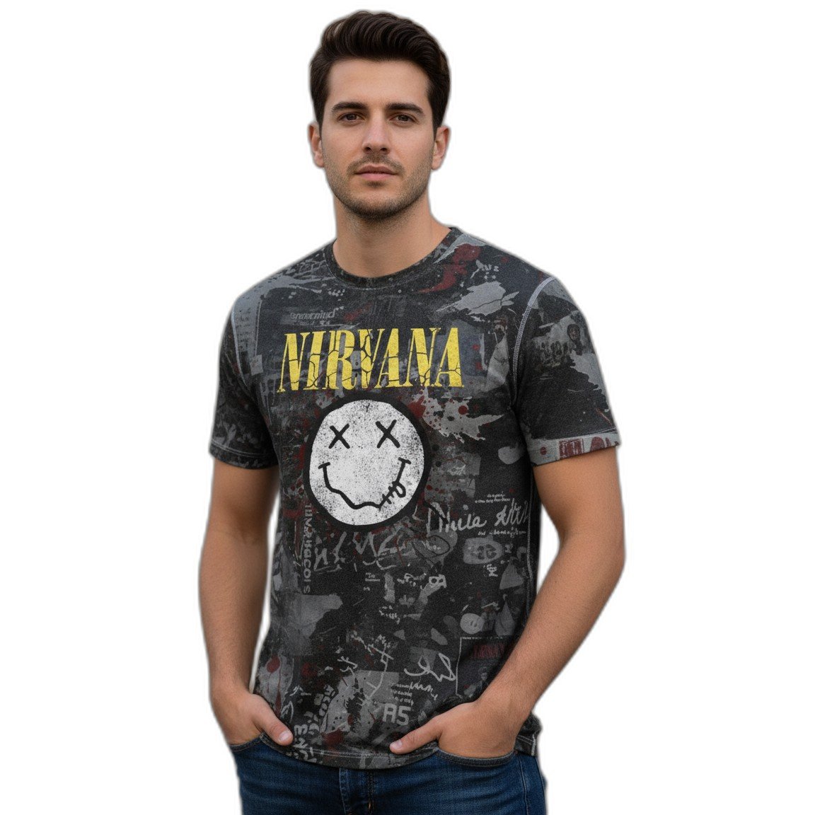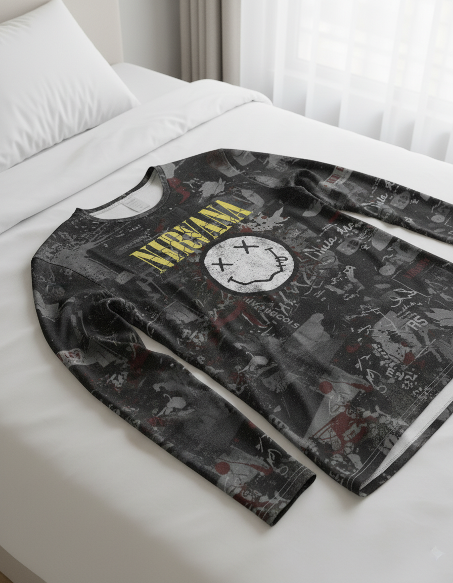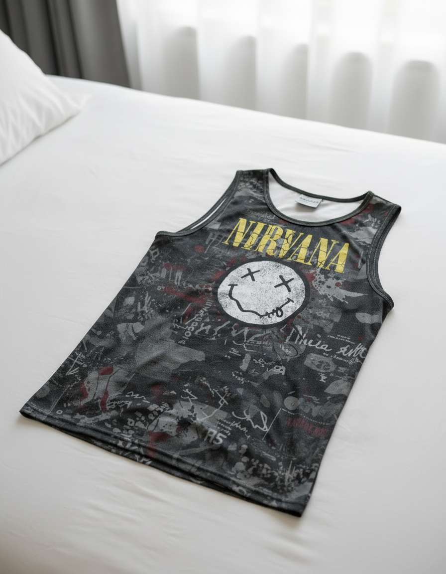 El emblemático logo de Nirvana, con su famoso smiley face, se despliega audazmente en el centro, creando un punto focal que atrapa todas las miradas. La impresión vintage da un toque desgastado que añade autenticidad y carácter, perfecto para cualquier amante del rock.