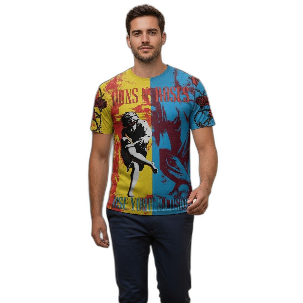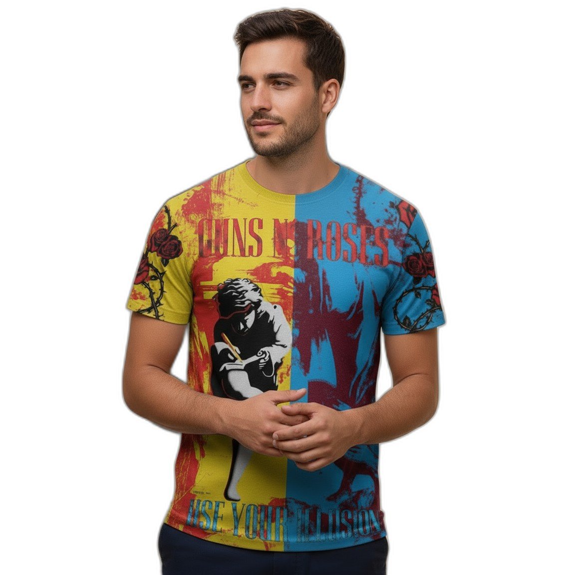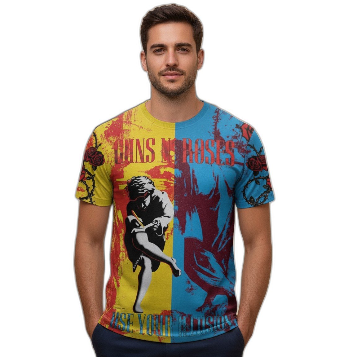 – **Estilo Clásico:** Con un gráfico vibrante que homenajea el icónico álbum ‘Use Your Illusion’, esta remera es el complemento perfecto para cualquier outfit, ya sea para un concierto o un día casual.