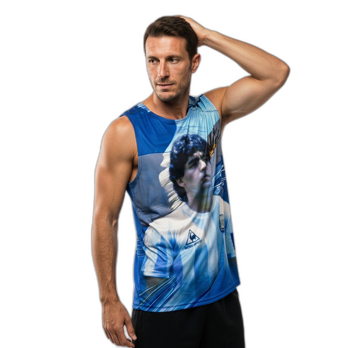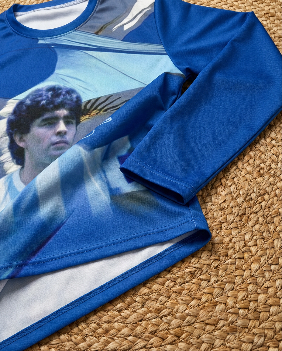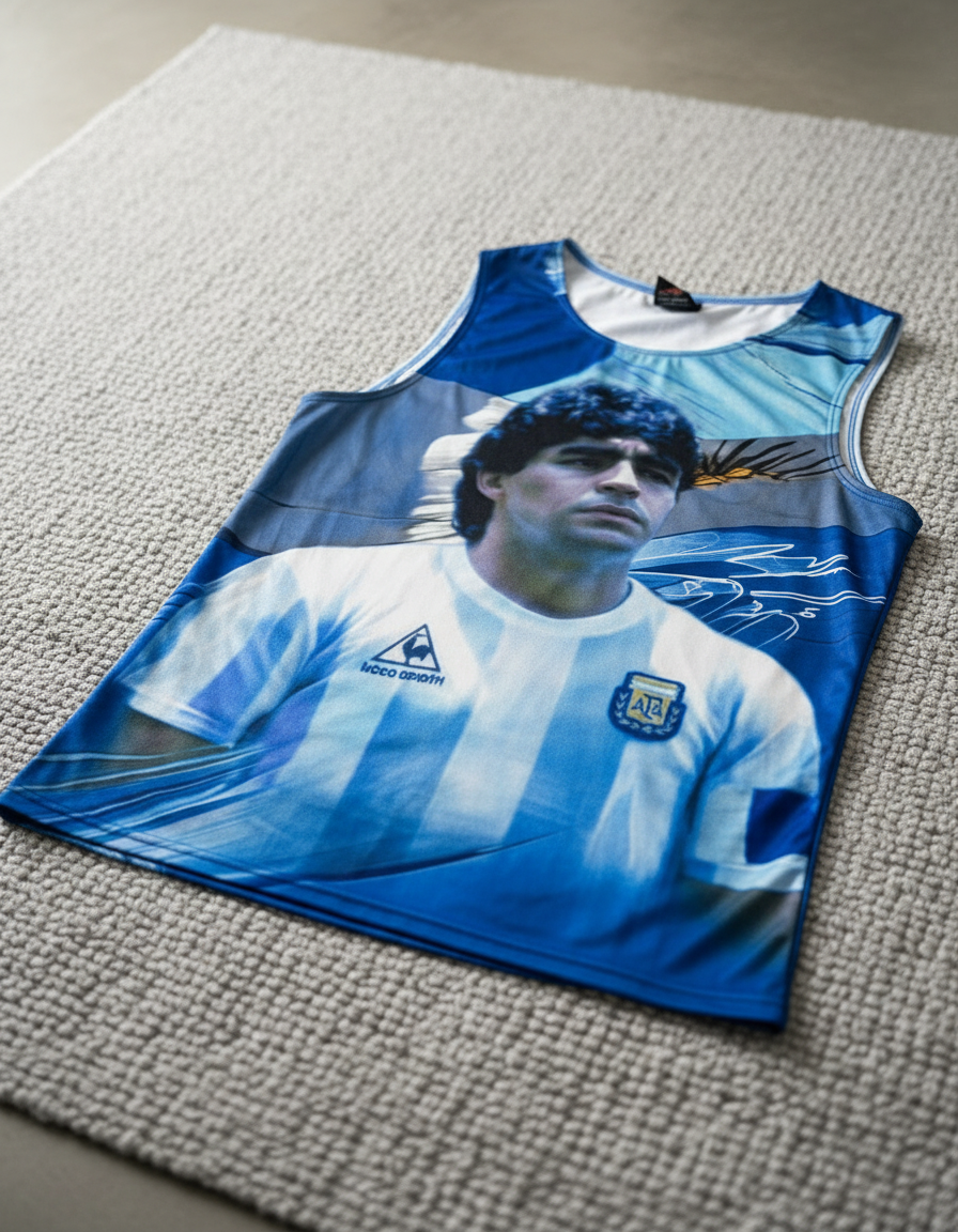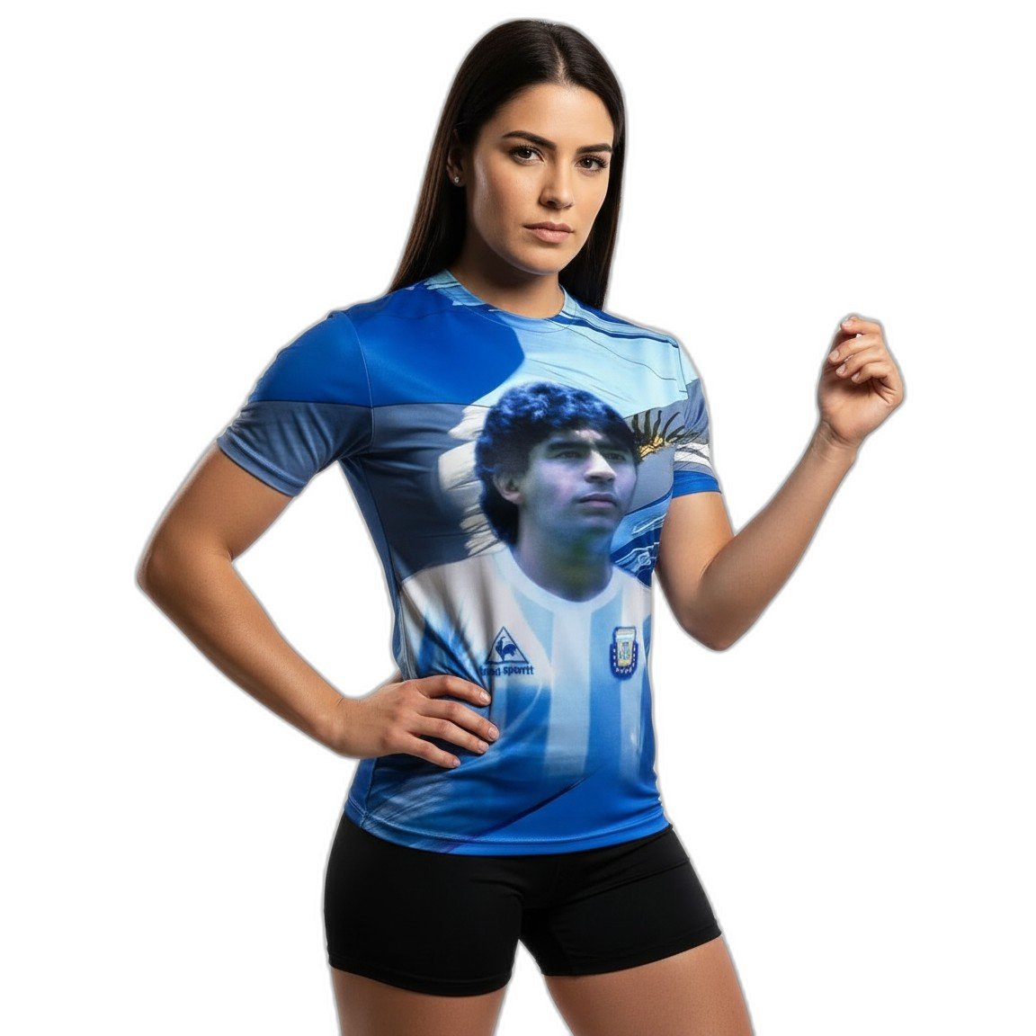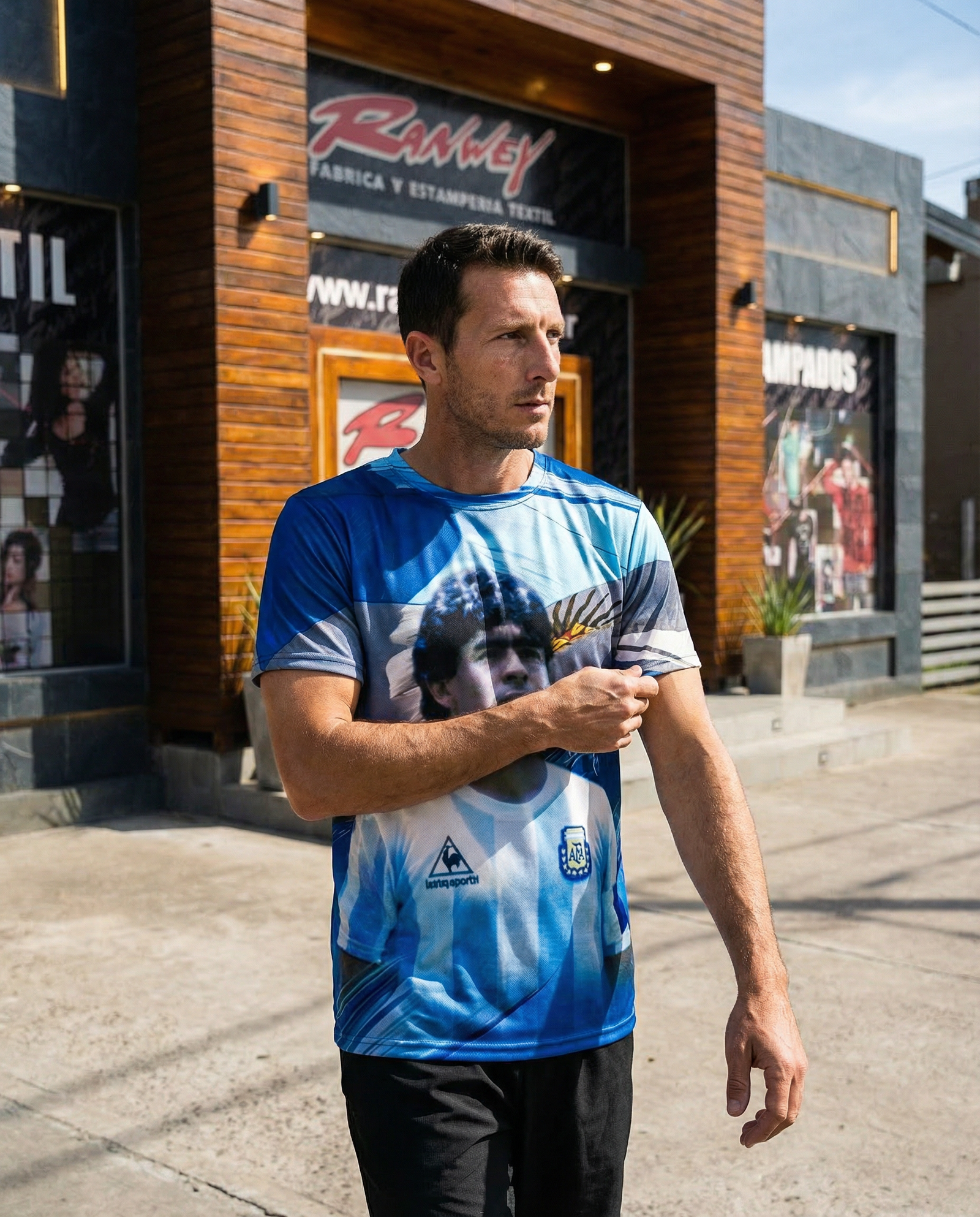 Fabricada con algodón de alta calidad, su tejido suave y ligero proporciona una comodidad excepcional, ideal para cualquier ocasión, ya sea en el campo de juego, en un encuentro con amigos o en una jornada casual. Su diseño distintivo presenta la bandera argentina, evocando la pasión que Maradona despierta en cada corazón argentino.